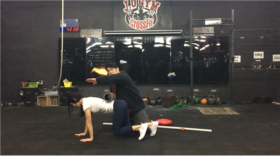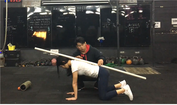 반대쪽 발과 반대쪽 손이 동시에 나아가는 상태로 기어가면 된다. 앞으로 갔다가 다시 뒤로 돌아오는 동작까지 같이 수행하는 것이 좋다. 쉽게 굴러 떨어지지 않을 만한 물건을 허리 위에 올린 채 기어가는 것은 척추의 중립 상태를 실시간으로 확인하기 위한 좋은 보조 수단이다. 다만 떨어뜨리지 않는 것 자체에만 집중할 경우 허리가 과도하게 젖혀질 수도 있으니 주의해야 한다.