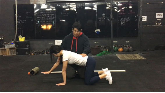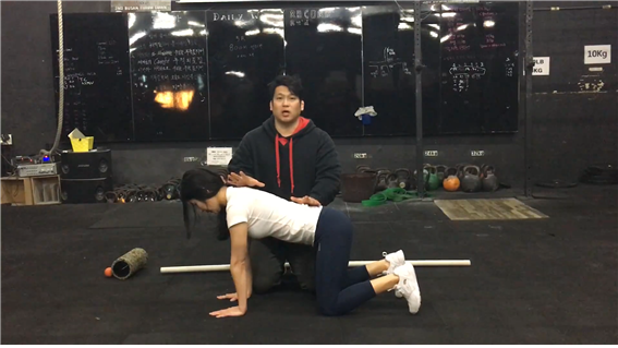 자세를 잡았다면 호흡을 해 보자. 자세는 방금 잡았던 그대로 최선을 다해서 유지해야 한다. 자세를 유지한 채로, 배를 한껏 부풀려 숨을 들이마신 뒤 다시 갈비뼈를 조이는 듯 한 느낌으로 내쉬는 훈련을 반복한다. 네 발로 기기에 앞서서, 척추의 이 상태를 유지하며 호흡을 올바르게 할 수 있는지를 확인하는 것이다. 자세를 잡았는데 숨도 안 쉬고 기어 다닐 수는 없는 노릇이니까. 척추를 중립 상태로 유지하면서 호흡을 하는 습관은, 비단 오늘 소개할 네 발로 기는 동작뿐만이 아니라 앞으로 하게 될 수많은 운동들에 있어서도 긍정적으로 작용하게 될 것이다.