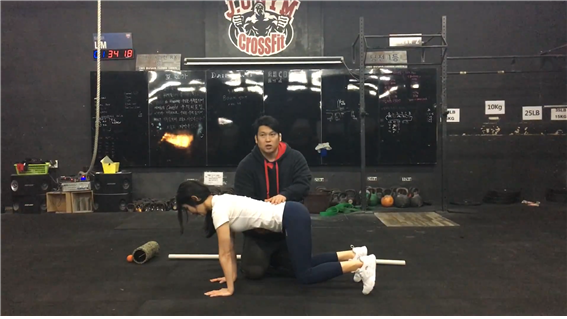 Step 2가 익숙해지게 되면 그 때 3단계로 넘어온다. 본격적으로 기기 시작하는 단계라고 봐도 무방하다. 제대로 몸을 고정한 다음, 첫 자세에서 양 무릎만을 살짝 공중에 띄운다.