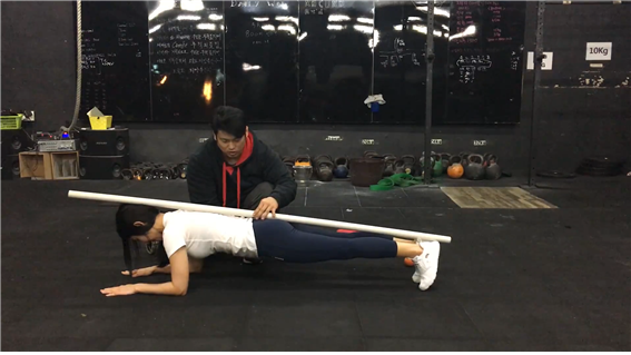 지금까지의 모든 단계에서 끊임없이 강조했던 척추의 균형 유지는 여기서도 매우 중요하다. 옆에 도와줄 사람이 있다면, 플랭크 자세를 취했을 때 그 위에 막대를 올려달라고 부탁해보자. 네 발 기기를 할 때 했던 것과 같다. 척추와 등, 그리고 꼬리뼈에 이르기까지 최대한 중립적인 상태로 만든다. 이렇게 해야 하는 이유는, 이 상태가 풀려 균형이 무너진다면 매우 큰 부하가 허리에 걸릴 수밖에 없기 때문이다. 호흡은 여전히 중요하니 끊임없이 숨을 쉬도록 하자.