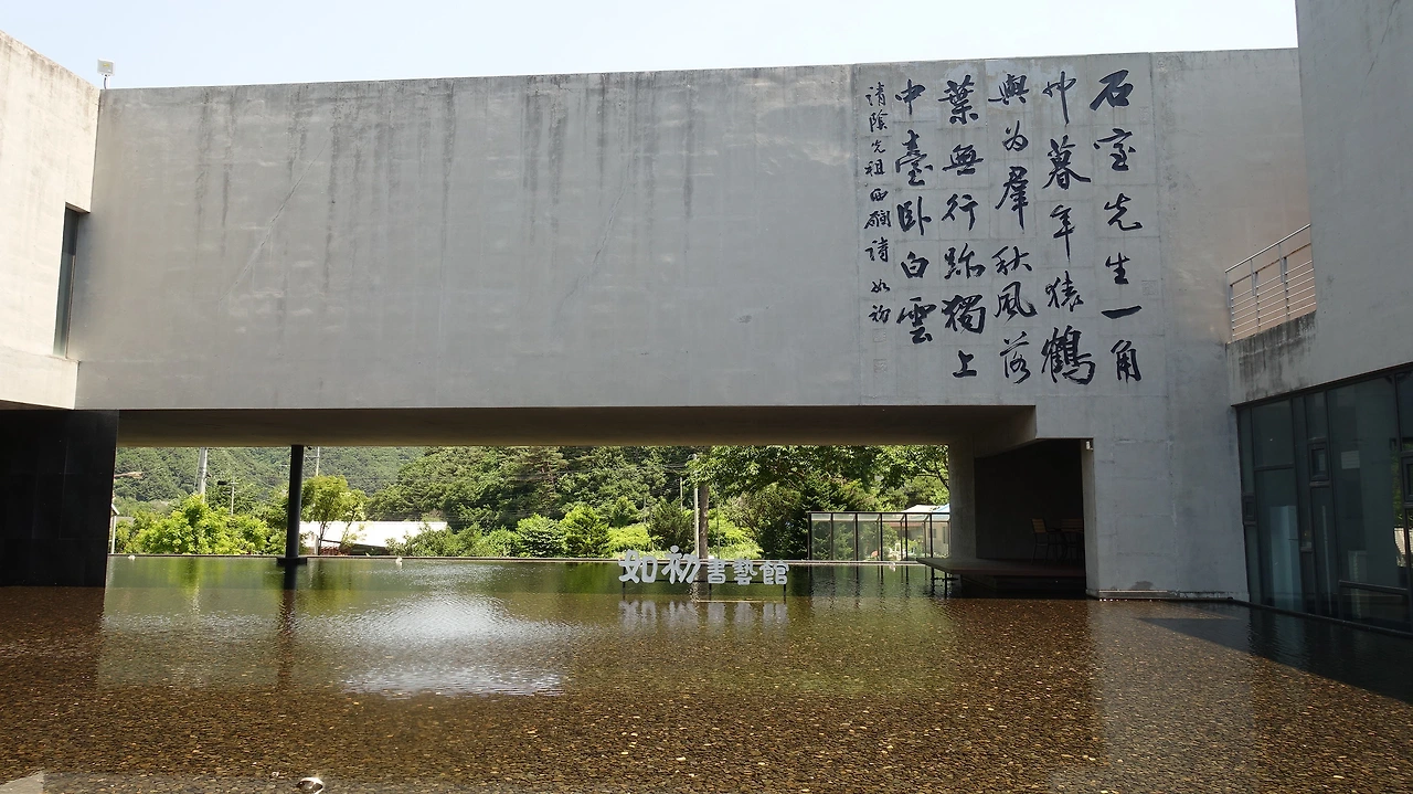 '서예'라는 이름이 붙어 괜히 고리타분하거나 지루할 것이라 지레 겁을 먹을 수 있지만 자연과 조화된 건축물과 꽤 재미난 프로그램으로 그런 우려를 단번에 무너뜨린다. 일단 건축물에 도착하면 건축에서부터 정적인 미학을 온몸으로 느낄 수 있다. 물, 텅 빈 공간, 곧은 건축관이 자연과 어우러져 강인하면서도 여백이 느껴진다. 입구 주변에는 얕은 물이 담긴 정원이 있는데 '여초서예관'이라는 팻말과 함께 이 공간의 주인공이신 '김응현 선생님'의 작품이 건축물에 새겨져 있어 그림 위에 그림이 올려져 있는 것만 같다. 수직적으로 분리된 각 공간 사이로 은근히 주변의 자연경관이 드리워져 건물과 자연이 하나로 연결되어 있는 듯한 모습을 띄고 있다. 서예를 1도 모르는 사람이 와서 공간을 감상하더라도 누구나 공간이 주는 아름다움을 느낄 수 있을 정도로 단정한 멋이 있다.