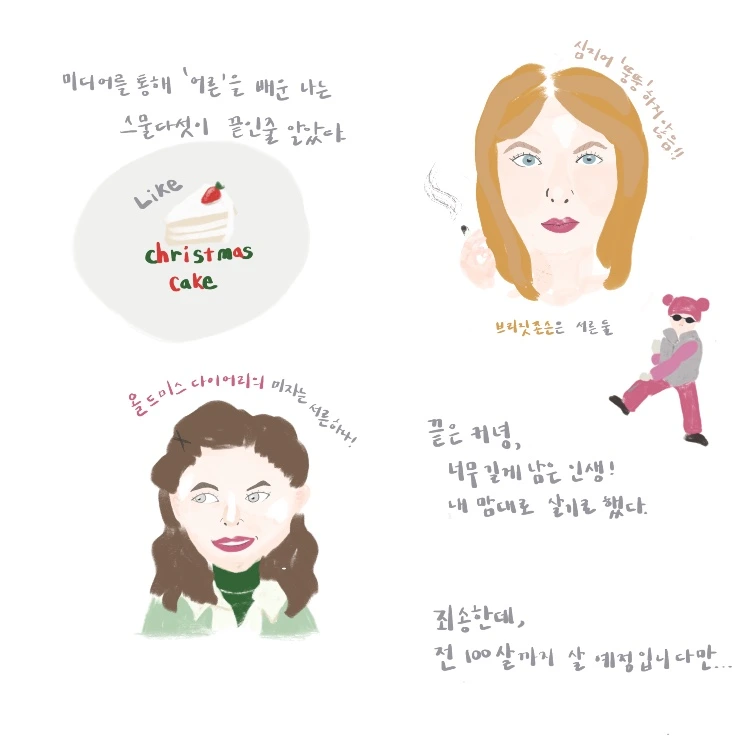 그때 나는 정말로 서른이 그렇게 올드한 나이인 줄 알았다. 결혼하지 않으면 안 되는 그런 나이. 막상 서른즈음에 그녀들을 보니 너무 어리기만 한 것 같다. 물론, 시대가 변했고 이젠 나이 따위에 의미를 붙이는 사람이 촌스럽게만 느껴지지만 여전히 마음 깊은 구석에서 가끔 그런 생각이 올라온다. 너무 오랫동안 미디어에 내 몫을 내어줬던 것 같다. 이젠 서른에 “老”를 붙이거나 스물다섯을 크리스마스 케이크 같은 것에 비유하진 않는다. 그치만 막상 그 나이가 되면 괜시리 마음이 몽글해지는 기분이 드는 것은 사실이다.