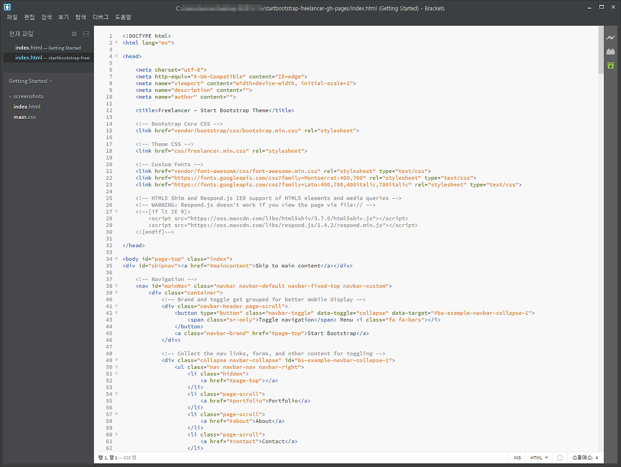 **줄바꿈 등의 문제로 메모장에서 도저히 알아볼 수가 없다면 Brackets같은 전용 에디터를 추천한다.(캡쳐화면 우)