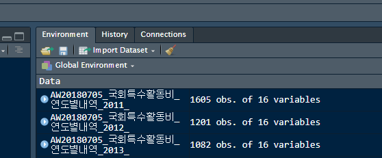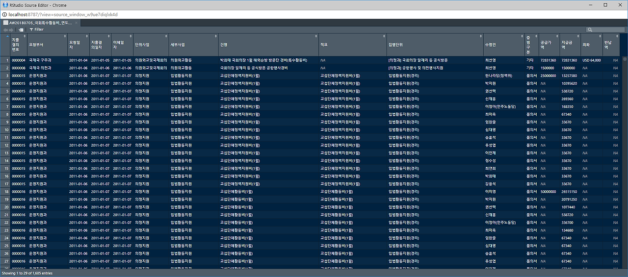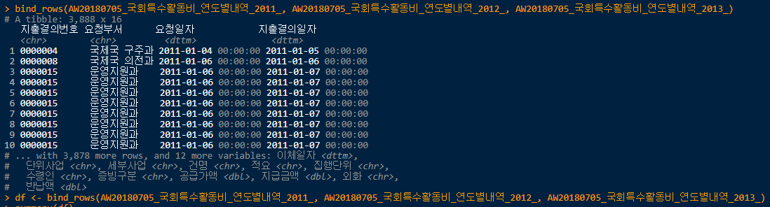 df <- bind_rows(AW20180705_국회특수활동비_연도별내역_2011_, AW20180705_국회특수활동비_연도별내역_2012_, AW20180705_국회특수활동비_연도별내역_2013_)