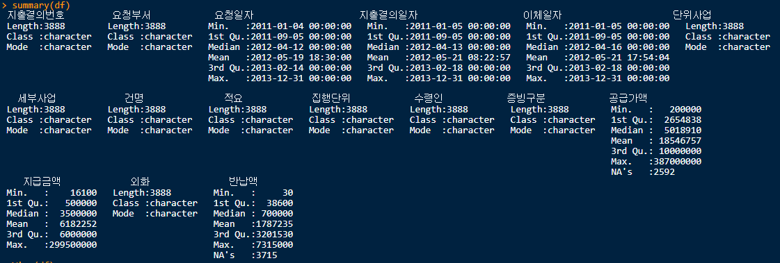 지급금액은 16,100원부터 299,500,000원까지, 그밖에 평균Mean값과 중위Median값도 한눈에 알 수 있다.