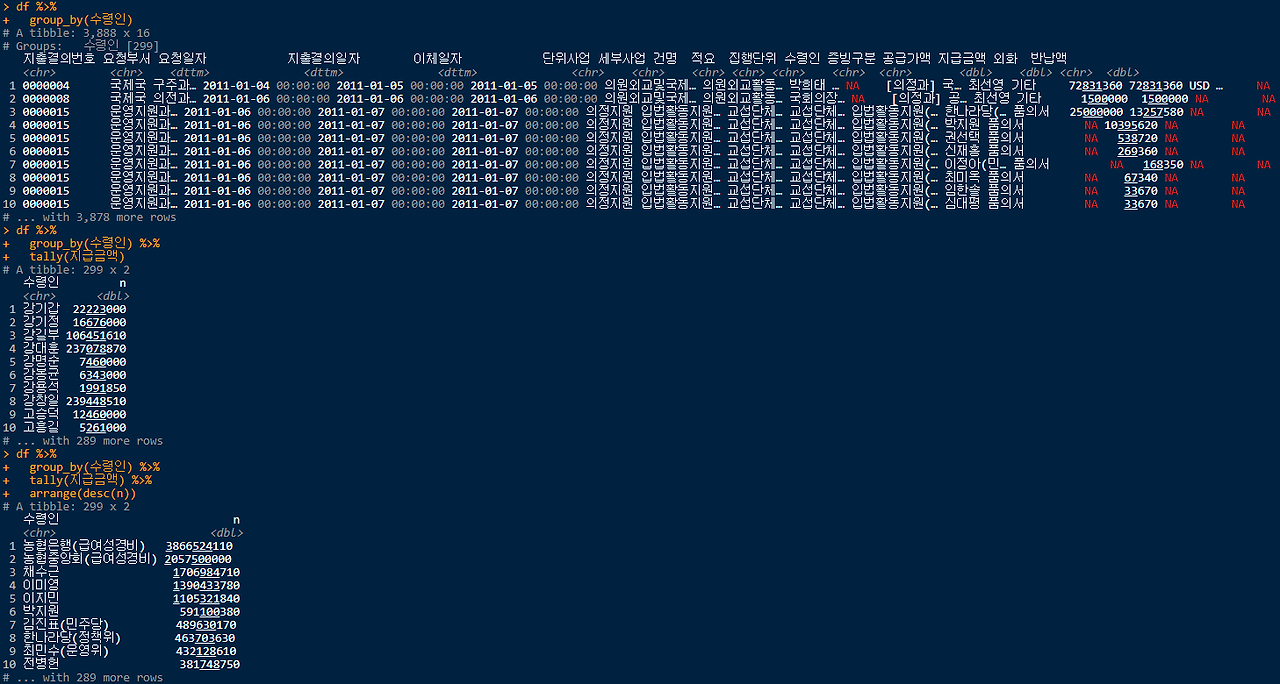 # A tibble: 299 x 2 수령인 n <chr> <dbl> 1 농협은행(급여성경비) 3866524110 2 농협중앙회(급여성경비) 2057500000 3 채수근 1706984710 4 이미영 1390433780 5 이지민 1105321840 6 박지원 591100380 7 김진표(민주당) 489630170 8 한나라당(정책위) 463703630 9 최민수(운영위) 432128610 10 전병헌 381748750 # ... with 289 more rows