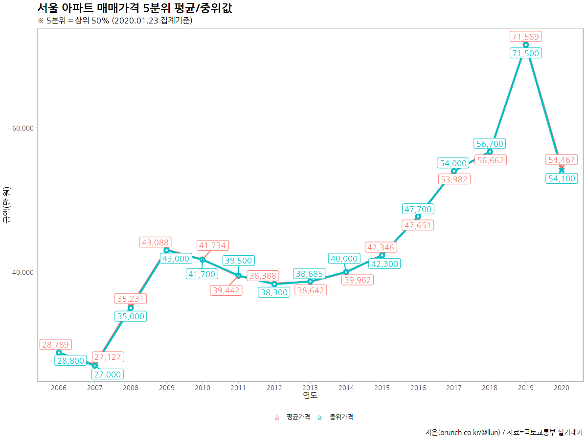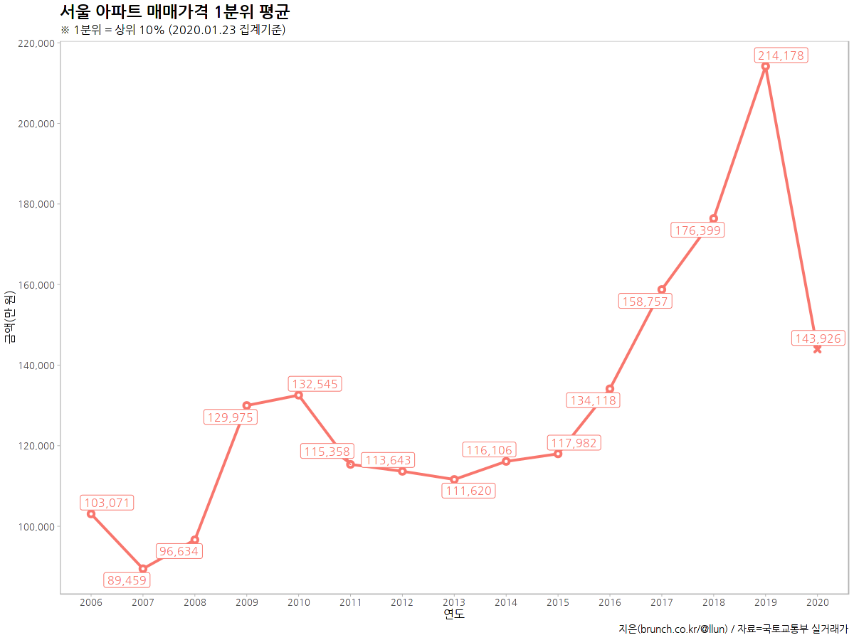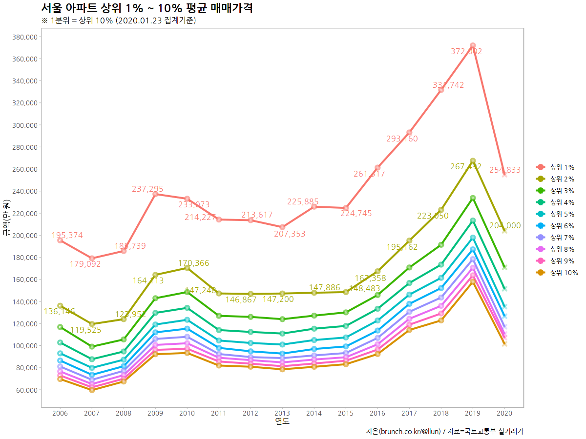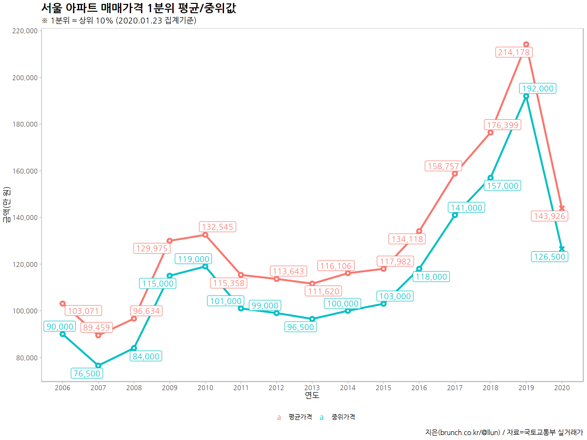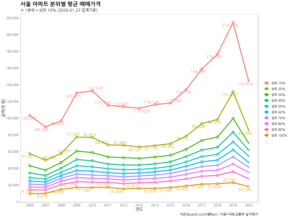 국민의 과반 이상이 서울에 살고 있지 않는데 '서울' 아파트, 그것도 상위 10%의 평균 매매가격이 얼마인 게 무슨 의미가 있겠나 싶지만―내집마련, 주택 구입에 관심을 둔 실수요자든, 투자와 투기를 넘나드는 자본가든, 이처럼 특정 분위를 나누어 그 평균값을 취하는 게 그리 중요치는 않을 것이다.