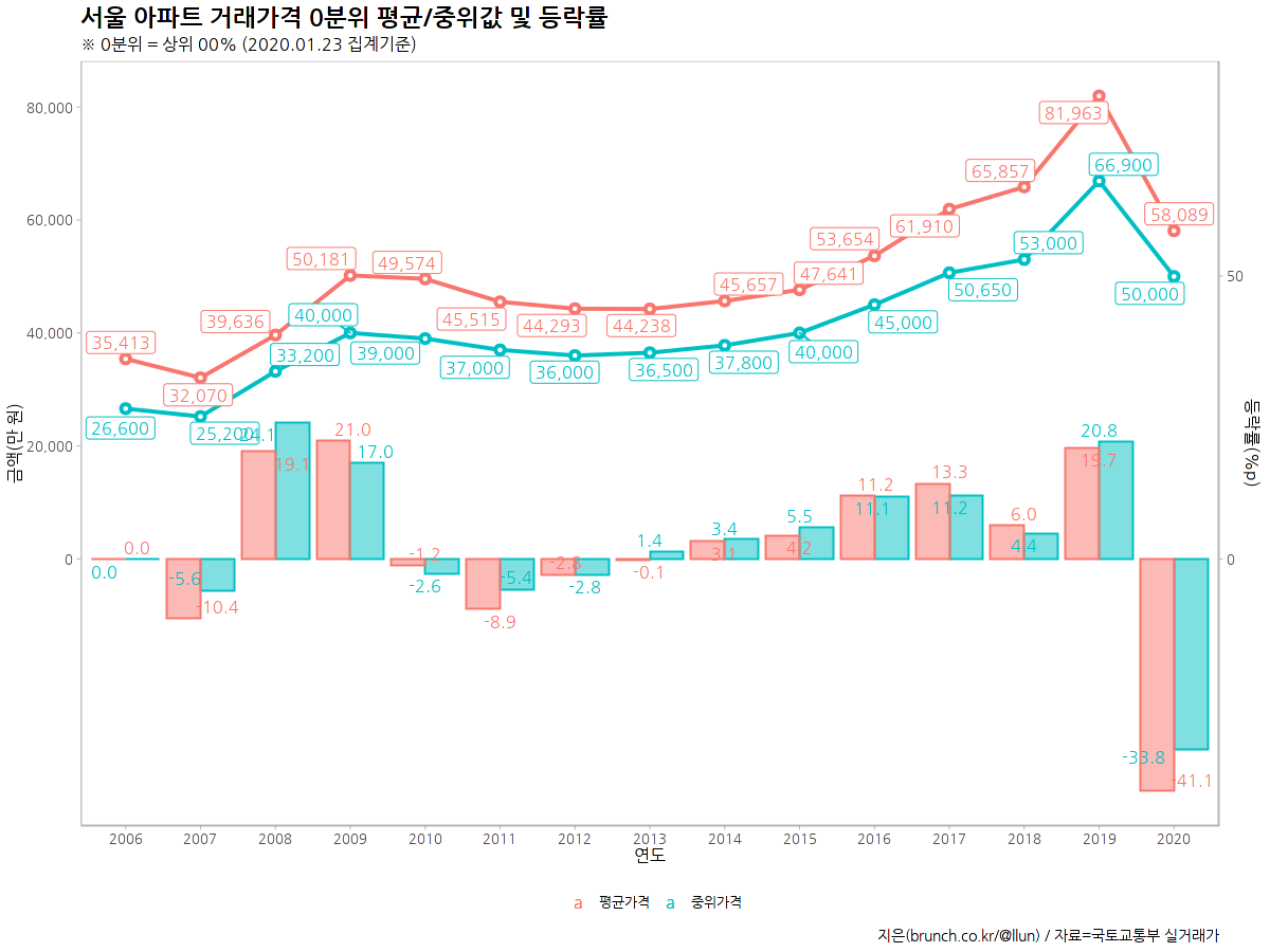 0분위는 아니고, 전체 서울 아파트 거래건을 대상으로 알아본 평균과 중간값 및 등락률을 덧붙인다.