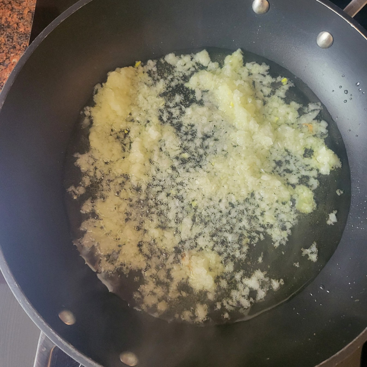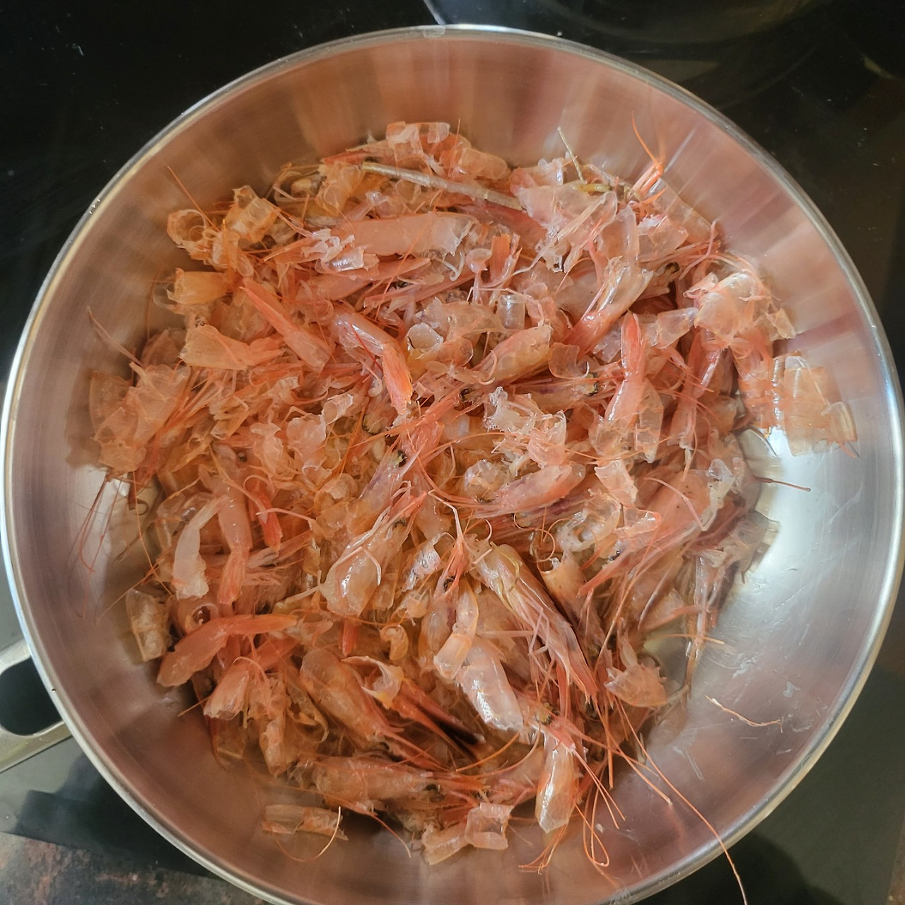 4. 작은 새우 머리와 껍질, 꼬리를 올리브유를 두른 프라이팬에서 볶습니다.