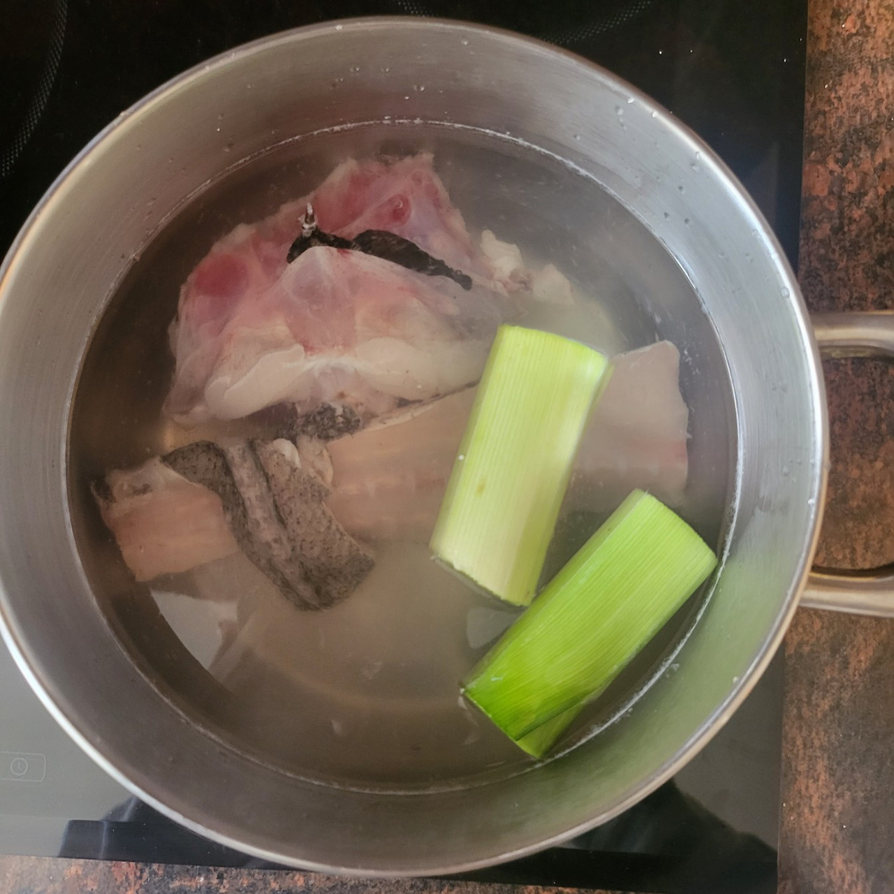 (스페인에서는 merluza (대구의 일종) 와 rape (아귀)라는 생선 뼈를 사용하며 파 반 토막 정도를 함께 추가합니다)