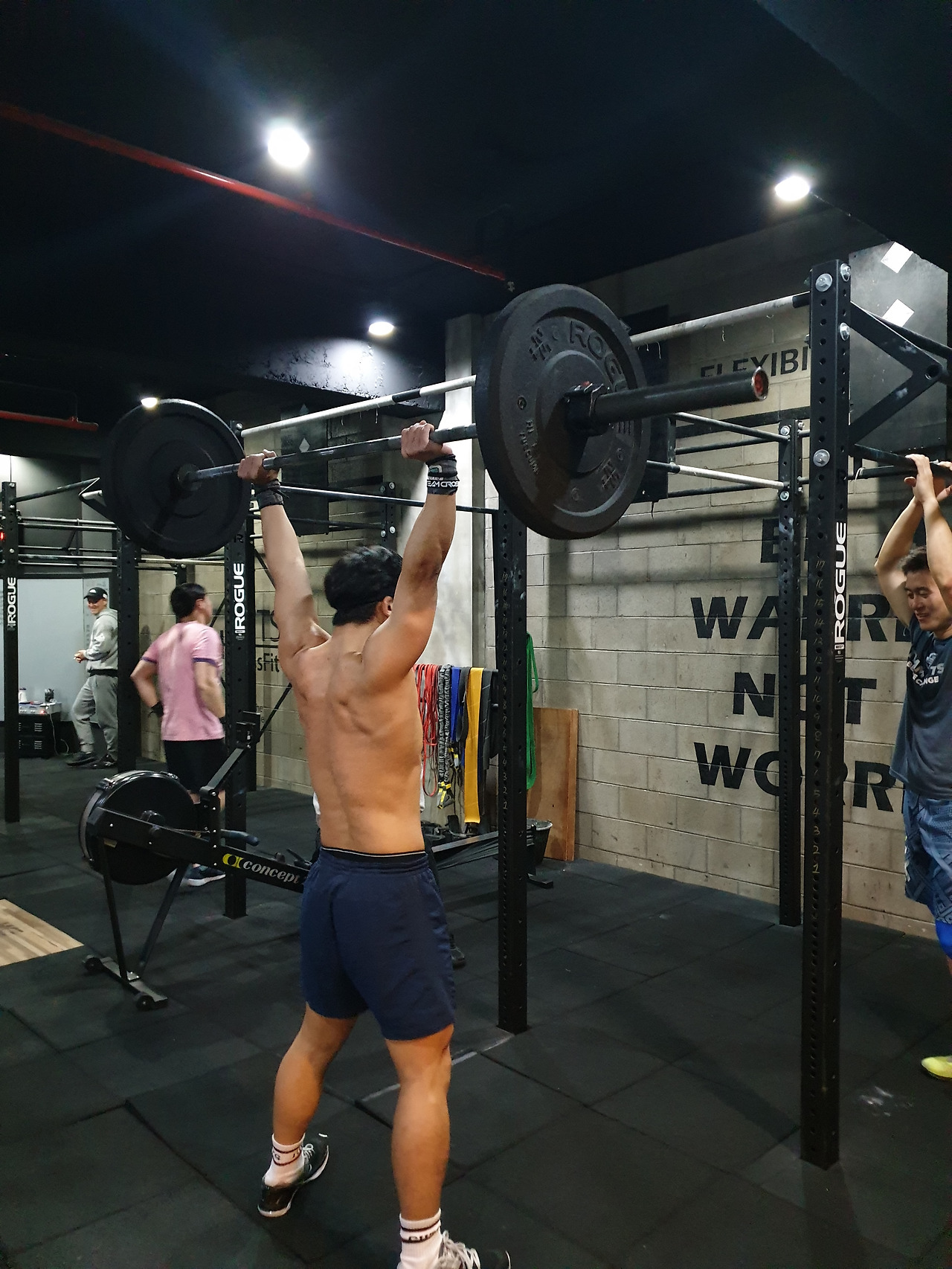 설렁-설렁, 대충-대충 Wod를 임했음에도 불구하고 20분이라는 시간이 경과했을 때 내 상태는 폐가 터질 것 같아 호흡을 제대로 하지 못했고, 겨우겨우 찾은 호흡에도 피맛이 섞여있었다. 더불어 다리는 힘이 들어가지 않아 몸을 다시 세울 수 없는 상태였다. 이런 내 몸 상태를 보고 나는 스스로 결과가 어찌 됐든 만족했었다. 다음 조가 측정을 시작하고 한참이 지나서야 호흡이 돌아와 정신을 차렸고 - 땀을 식히며 측정을 수행하는 크로스피터들의 모습을 관찰했다.