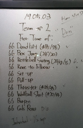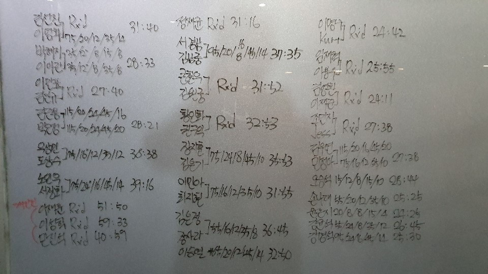 '빽판'은 크로스핏 박스 라면 운동기구와 더불어 반듯이 갖추고 있어야 하는 것이다. 이 빽판에는 WOD (Workout of the day)와 당일 운동 참여자와 참여자들의 기록이 적혀있다. 운동 시작 전 크로스피터들은 빽판에 적힌 WOD를 보며 머릿속으로 이미지 트레이닝을 하기도 하고, 어떤 식으로 WOD를 진행할지 계획을 세우기도 한다. 아 물론, 나는 타이슨 형님의 명언을 생각하며 아무 생각 없이 빽판에 적힌 WOD를 멍하니 쳐다볼 뿐이다.