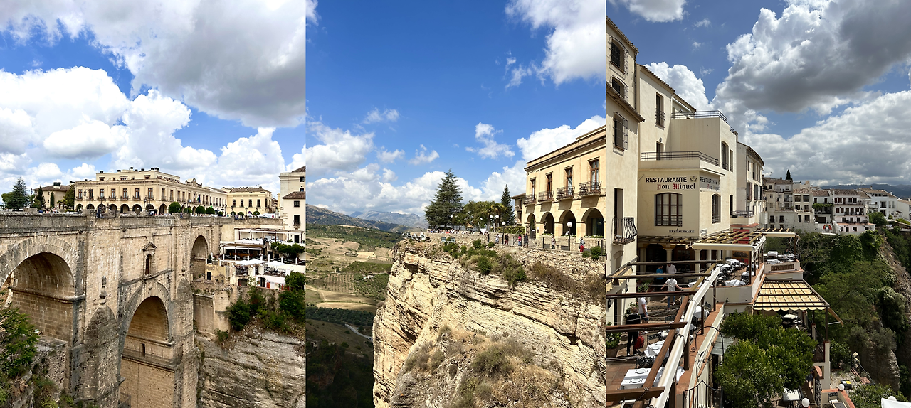 자는둥 마는둥 하고 떠난 다음 일정. 대표 관광지가 된 누에보 다리와 역사 깊은 수도원과 숙소가 한데 모여있는 론다였다. 조금의 자비도 없이 수직으로 깎아지르는 절벽 위에 평화롭게 자리 잡고 있는 레스토랑과 카페, 숙소들의 조화가 다른 세계에 온 듯한 느낌을 주었다. 특히, 누에보 다리에서 내려다보는 절벽의 광경은 말로 표현하기 어려울 정도로 신비하고 아름다운 스페인의 모습들 중 하나였다.