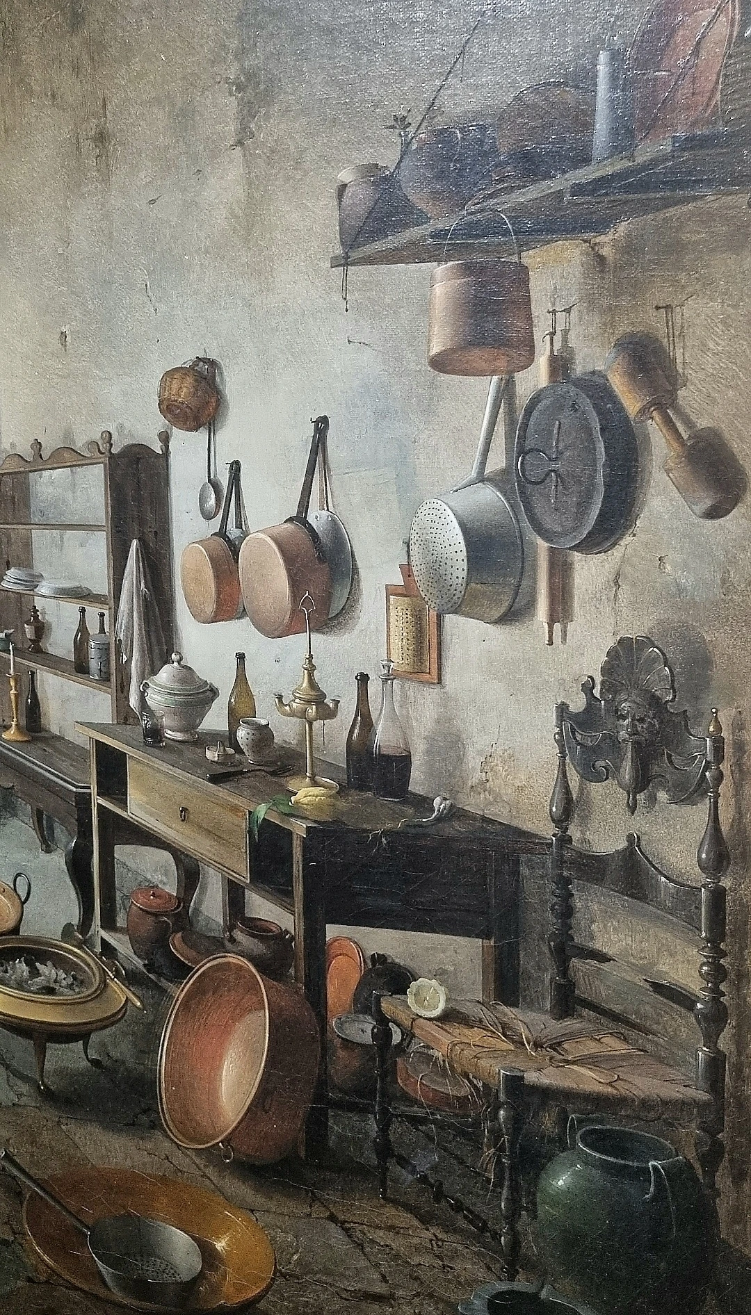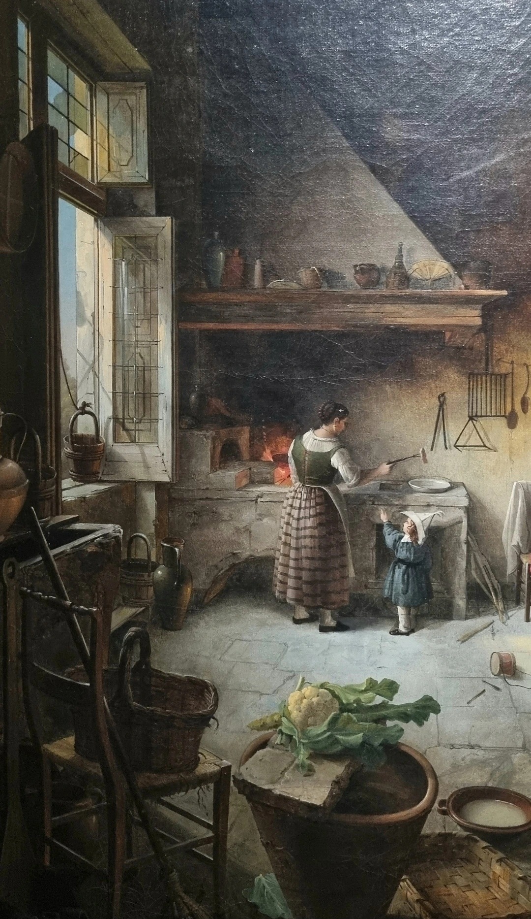 이 작품은 현실적이면서도 만화 그림 같다. 나는 이 그림 앞에서 한참을 머물렀다. 사물을 하나하나 관찰하는 재미가 컸다. 물체의 질감이 기가 막히게 표현되어 있다. 특히 벽에 걸려 있는 냄비나 바닥에서 뒹구는 양동이는, 손으로 ‘똑똑’ 치면, 양은을 칠 때 나는 특유의 ‘통통’ 소리가 들릴 것만 같았다. 짚신으로 만든 빗자루와 바구니도 촉감이 상상되었다. 막걸리 색의 꼬질꼬질한 물도, 빛 표현이 대단하다. 문 위의 꾸깃꾸깃한 종이부터, 거친 벽돌까지 뜯어보며 감상하다 보면 시간 가는 줄 모른다.