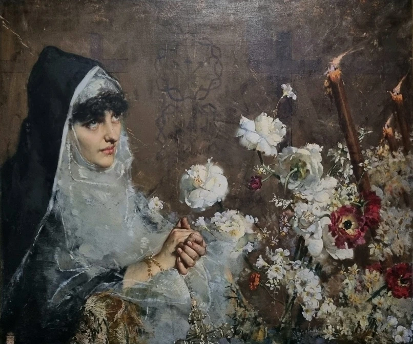 그림을 하나하나 자세히 들여다보면 굉장히 사실적이지만, 전체적으로 바라보았을 때는 사진이 아닌, 움직이는 영화적 효과처럼 느껴졌다. 마치 애니메이션에 나오는, 인물을 둘러싸며 샤방샤방 빛나는 꽃 효과처럼 말이다. 마법에 걸린 듯한 꽃이 수녀의 카리스마를 만들어주는 장치 같았다. 흔히 수녀 하면 떠오르는 수수하고 단출한 모습과는 정반대로, 그림은 강렬하고 매혹적으로 다가왔다. 수녀의 초롱초롱하면서도 굳센 눈빛, 그리고 불타오르는 촛불이 이러한 분위기를 더욱 고조시켜 주는 것 같다. 평화롭고 조용한 방에서 기도하는 수녀라기 보다는, 사실 이렇게 표현해도 될지 모르겠지만, 저주를 기획하고 있는 마녀 같다는 느낌을 받았다.
