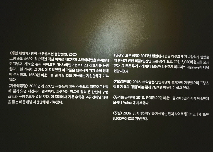 관객의 입맛에 맞춰진 작품은 예술이 아닌, 상품에 가깝다고 생각한다. 사실 전시 초반에는 뱅크시가 관객을 자극할 만한 소재를 일부러 고르는 게 아닌가 의심스러웠다. 그러나 전시를 통한 그를 알아가는 과정에서 오해를 풀 수 있었고, 작품들 역시 마음 놓고 편히 신뢰할 수 있게 되었다.