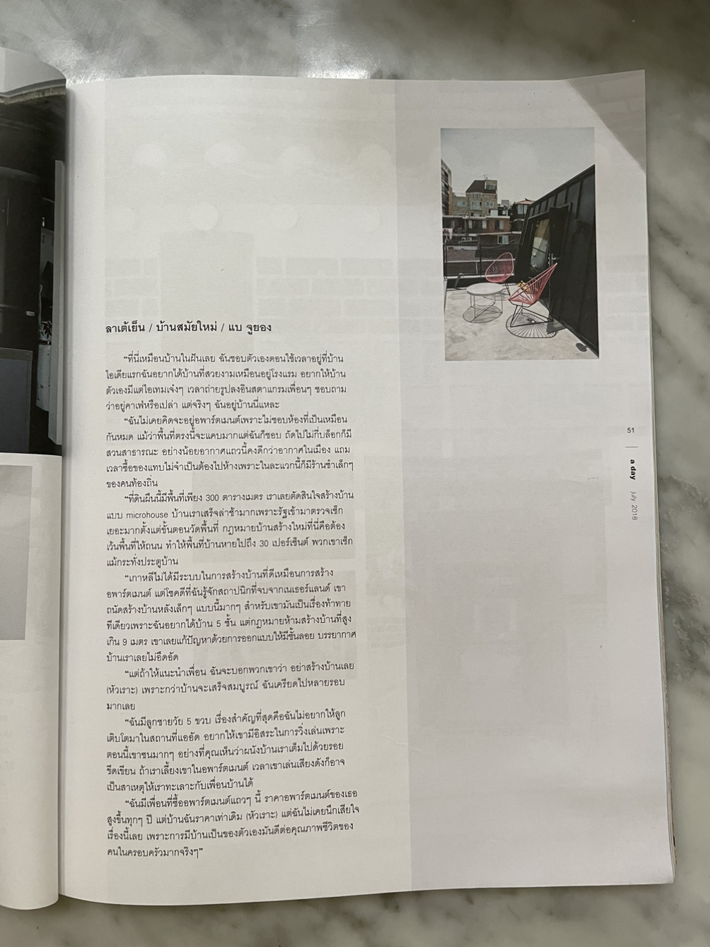 한 곳은 전문 건축 잡지였고, 다른 한 곳은 독특하게도 태국의 라이프 스타일 잡지였다. 한국의 <around> 같은 잡지였는데 <서울>이라는 주제로 서울에 출장을 와서 여러 모습을 취재하다가, 지인을 통해 우리 집을 소개받은 것이다. 촬영 날, 잡지의 에디터인 Ben을 만나게 되었다. Ben은 서울에 가득한 아파트들에 대해서도, 왜 이런 독특한 집을 짓게 되었는지에 대해서도 궁금해했다. 인상적이었던 점은 5층 테라스의 풍경을 매우 흥미로워했다는 점이다. 나에게는 익숙한 다세대들이 펼쳐진 풍경인데 Ben과 포토그래퍼는 그 풍경을 쉬지 않고 촬영했다. (후에 Ben이 보내준 서울 편 잡지를 보니 다세대의 풍경이 <서울의 집>이라는 꼭지의 메인 사진으로 배치되어 있었다) 촬영 때 당황스러웠던 점이 있었다. 혹시 나도 촬영에 들어가게 되냐고 사전에 여러 번 체크했는데 아니라는 대답을 들어서 정신없이 청소만 하다가 촬영팀을 맞았다. 그런데 갑자기 계획이 변경되어서 나도 촬영컷에 들어가게 되어서 청소하던 모습 그대로 촬영컷에 들어가게 되었다... (혹시 모를 일도 준비하는 습관은 매우 좋은 것이라는 것을 다시 한번 깨달았다)