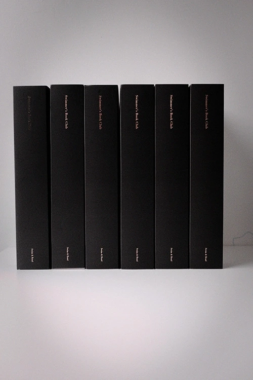 스위머스북클럽의 제품을 담아낼 패키지는 두 가지 종류로 기획되었다. 하나는 파자마를 담을 상자, 다른 하나는 문구 세트를 담을 상자였다. 수영과 책이라는 메시지를 동시에 전달하기 위해 디자이너분과 많은 이야기가 오고 갔다. 그리고 디자이너분이 천재적으로 만들어주신 패키지가 일렁이고 있는 수영장이 담긴 책을 연상케 하는 박스였다. 박스는 정적이며 움직이지 않는 물성을 가지고 있다. 하지만 그런 물성을 벗어나 일렁이고 있는 수영장 바닥을 바라보고 있는 듯한 이미지를 떠올리게 하는 것은 감탄을 자아냈다. 패키지 제작은 최소 수량이 꽤 크기 때문에 시작하는 스몰브랜드가 제작하기는 비용과 재고부담이 크다. 나 또한 예상되는 견적서를 받아 들고 정말 진행하는 맞는 것일까?라는 고민을 했지만 스위머스 북클럽의 메시지를 진심으로 전달하고 싶은 마음이 컸기 때문에, 과감하게 패키지에 투자하기로 했다. 파자마 박스는 사이즈가 크기 때문에 박스의 모양이 무너지지 않게 많은 신경을 썼다. 겉면의 박스 하나와 안쪽에 접어서 들어가는 무광의 하얀 박스가 하나 더 있다. 겉면 패키지의 시안은 수채화 버전이 하나 더 있었지만 깔끔한 현재의 시안으로 가기로 했고, 박스의 등에는 책처럼 스위머스 북클럽의 로고를 새겨 넣었다. 고급스러운 느낌을 일관되게 가지고 가고 싶었기 때문에 글자는 금박으로 인쇄했다. 그리고 예상했던 대로, ‘은’ ‘금’이 들어가는 공정은 다 비용이 비쌌다. 하지만 가능한 한 가장 아름다운 패키지를 제작하고 싶었기 때문에 이 부분도 포기하지 않았다. 이렇게 내 영혼과 돈을 다 갈아 넣었다는(?) 패키지가 탄생되었다.
