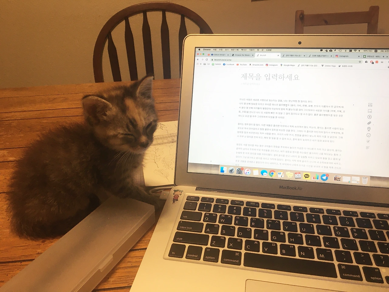 방금도 서랍 정리를 하는 동안 꼬마들이 한참을 주위에서 놀다가 지금은 다 어디론가 자러 가고 없는데, 몽이는 끝까지 남아서 주위에 이것저것들을 건드리고, 내가 냉동실 정리를 하는 동안 물끄러미 나를 쳐다보는 통에 그 눈빛에 못 이겨 정리를 대충 마무리했다. 결국 몽이를 안고 나머지 할 일들을 하려고 담요에 둘둘 말고 품에 넣었다가 그냥 포기하고 몽이를 데리고 식탁에 앉았다. 몽이는 식탁 위에 올라가 신나게 내 손목 보호대와 싸우고, 온갖 것들을 냄새 맡고 물었다가 다시 내려지고, 또 바닥에서 나에게 뜨거운 시선을 보내며 내 발을 톡톡 건드리다가 올려져서는 내 랩탑 옆에서 꾸벅꾸벅 졸고 있다. 왜 흔들흔들거리면서도 자꾸 앉아서 조는지. 편하게 누우라고 담요를 깔아줘도 그릉그릉 소리를 내며, 여전히 앉아서 졸고 있는 모습이 안쓰럽고 귀여운 몽이.