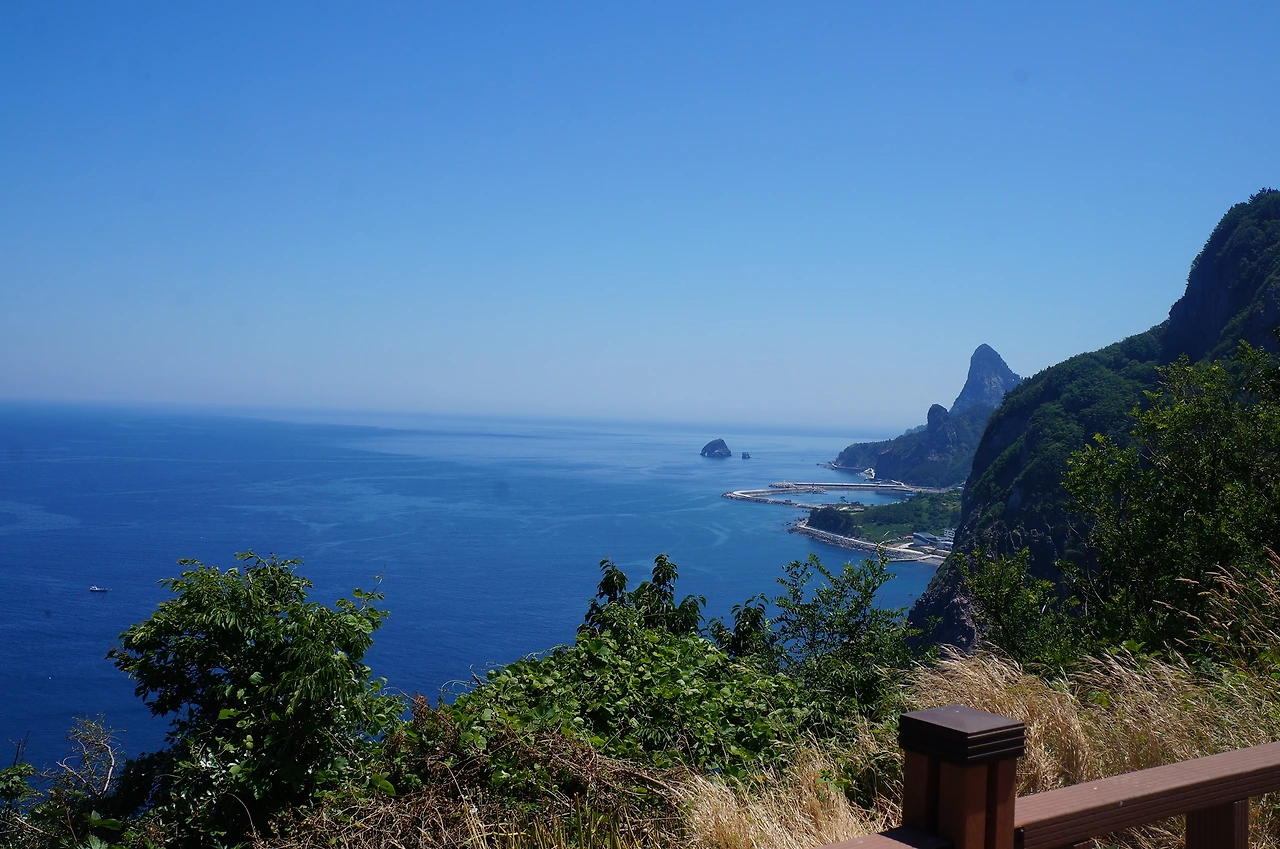 짐을 정리하고 나서는데 리조트 사이로 보이는 바다가 할 말을 잃게 만들었다. 여기가 국내야, 해외야 싶을 만큼 이국적이고 아름다웠다. 바다는 강릉에서도 많이 봤지만 울릉도 바다는 또 다른 느낌으로 다가왔다. 좀 더 깊고 푸른 느낌. 어디든 낯선 곳에서 보면 더 새로운 법이다. 제주도도 멋지지만 울릉도는 사람 발길이 덜 닿은 천혜의 자연환경을 가진 느낌이다. 울릉도 아직 안 가보신 분들, 코로나 끝나면 꼭 한번 가보세요. 두 번 가보세요. 한국에 이렇게 아름다운 곳이 있답니다.
