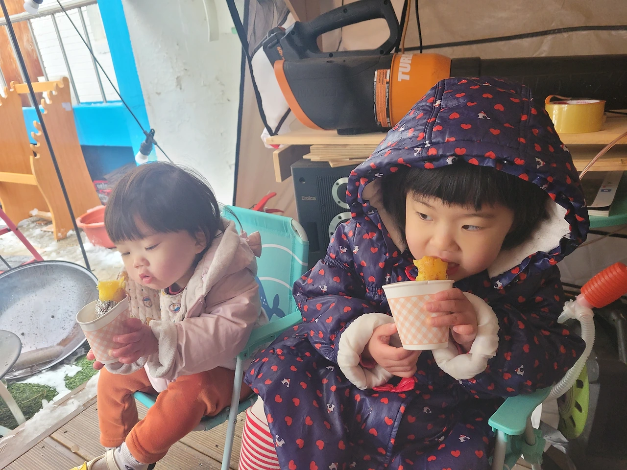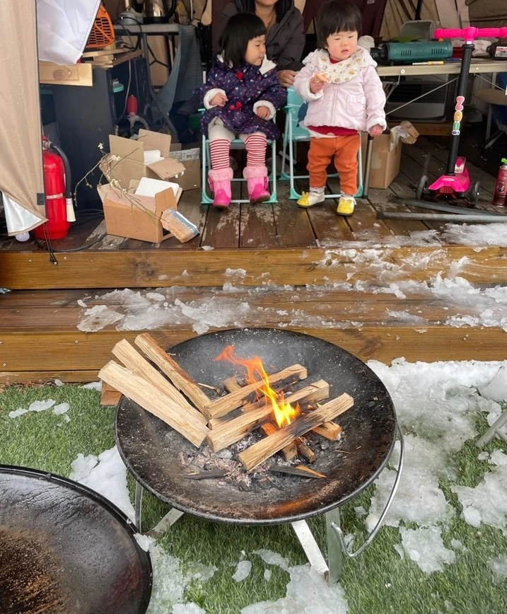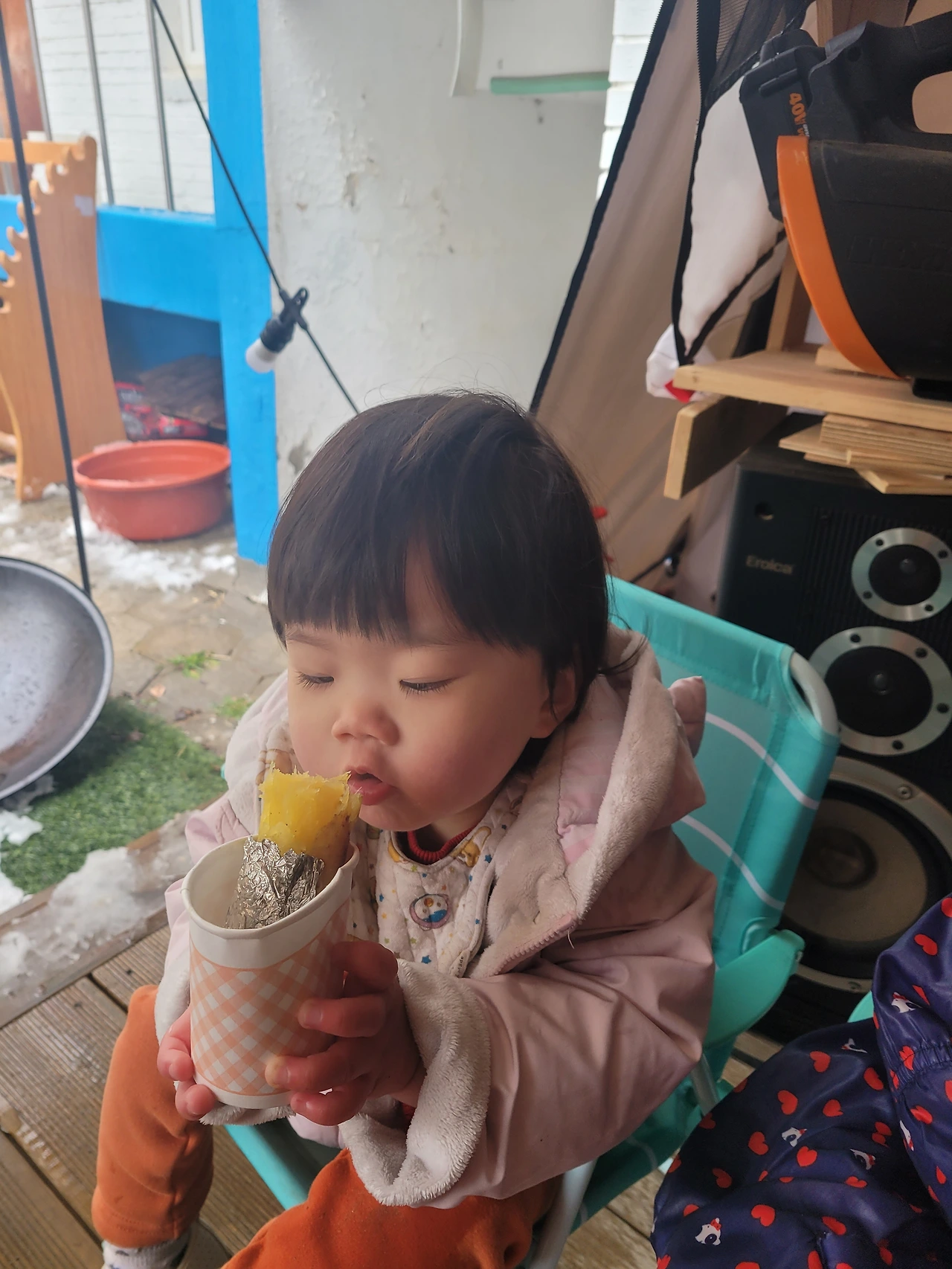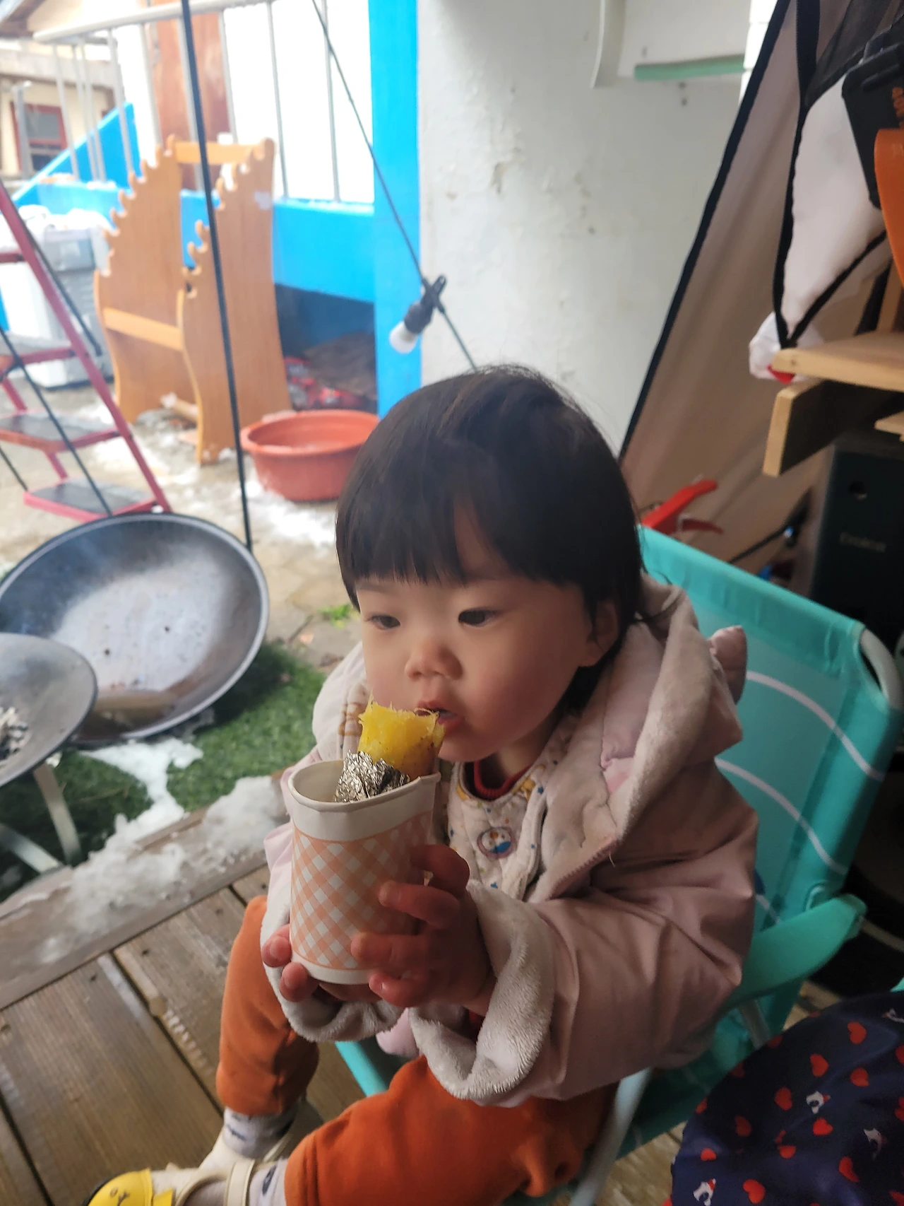 눈 오는 날의 캠핑은 분위기가 넘쳤다. 거기다 따뜻한 장작에 구운 고구마라니! 장작불에 구운 고구마가 그렇게 맛있을 수가 없었다. 에어프라이어에 돌려 먹는 것과는 차원이 달랐다. 김이 폴폴 나는 속이 노란 고구마에 아이들은 열광했다. 19개월인 둘째는 '후후' 연신 고구마를 불며 고구마를 먹겠다는 애정을 불태웠다.