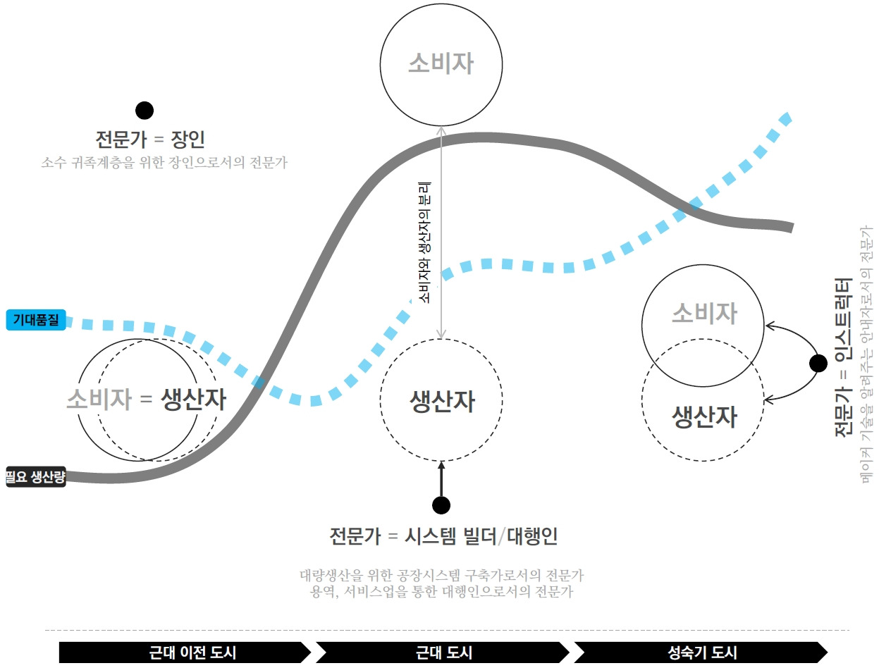 근대사회로 접어들며 상황은 변한다. 근대의 인구 급증으로 대량생산이 필요해지자 소비자와 생산자의 거리는 차츰 멀어지다 어느샌가 완벽히 분리돼 버렸다. 방망이 깎던 노인의 역할은 공장과 시스템이 가져갔다. 좋은 품질보다는 많은 양의 빠른 공급이 중요했다. 전문가의 역할은 직접 짓던 장인에서 공장 시스템을 효율적으로 만드는 시스템 빌더의 영역으로 넘어갔다. 혹은 용역, 서비스업으로 이동해 건축가, 요리사가 되어 바쁜 주민을 대신해 의식주를 빠르고 저렴하게 지어주는 역할을 하게 된다. 대중은 의식주를 직접 짓는 대신 간편하게 “구입”하기 시작했다. 우리는 더 이상 짓지 않는 삶을 살고 있다.
