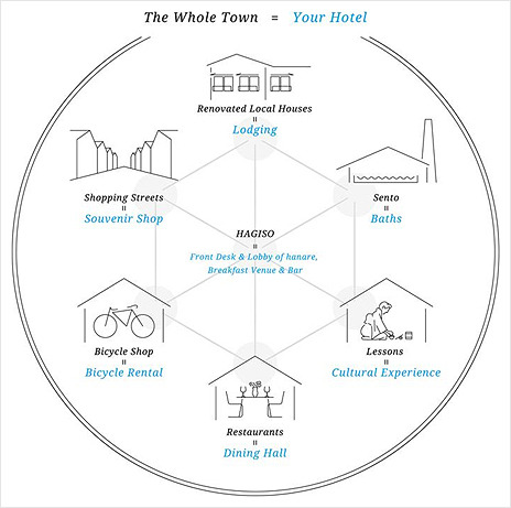 하나레에서는 지역 내 6곳의 지역 목욕탕을 이용할 수 있는 쿠폰을 매일 제공한다. 각 목욕탕의 위치와 함께 물의 온도, 탕 별 특징 등을 적어놓아 관광객을 위한 목욕탕이 아닌 지역 주민이 일상에서 동네 문화의 일부로 이용하는 목욕탕을 경험할 수 있게 한다. 하기소와 하나레는 야나카 마을의 다양한 개성 있는 가게와 목욕탕까지 속속들이 경험해 볼 수 있는 커뮤니티 호텔을 통해 지속가능한 도시재생을 이끌어가고 있다.