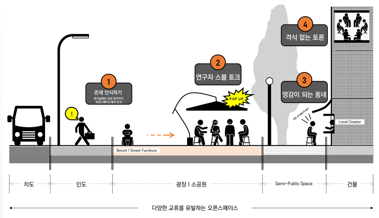 오픈스페이스에서는 다른 분야의 학자들을 힐끗 훔쳐볼 수 있고, 그 만남이 제3의 공간이라 불리는 bar, 테라스 카페, 편의점 그르르갉의자 같은 곳을 거쳐 본격 연구실 내 치열한 토론으로 이어질 수 있다면, 어궁동은 혁신과 창의가 터져나가는 유일무이한 정체성의 동네가 될 것입니다. 실내에서 아무리 영어이름 쓰고 ceo가 후드티를 입어도 같은 분야 같은 얼굴만 봐서는 혁신의 스파크는 일지 않습니다. 실리콘밸리, 테헤란로, 판교와도 전혀 다른, 어궁동에 와야만 즐길 수 있는 동네토론 혁신놀이터가 되어야 합니다. 제2의 실리콘벨리, 제2의 판교처럼 한심한 소리도 없습니다.
