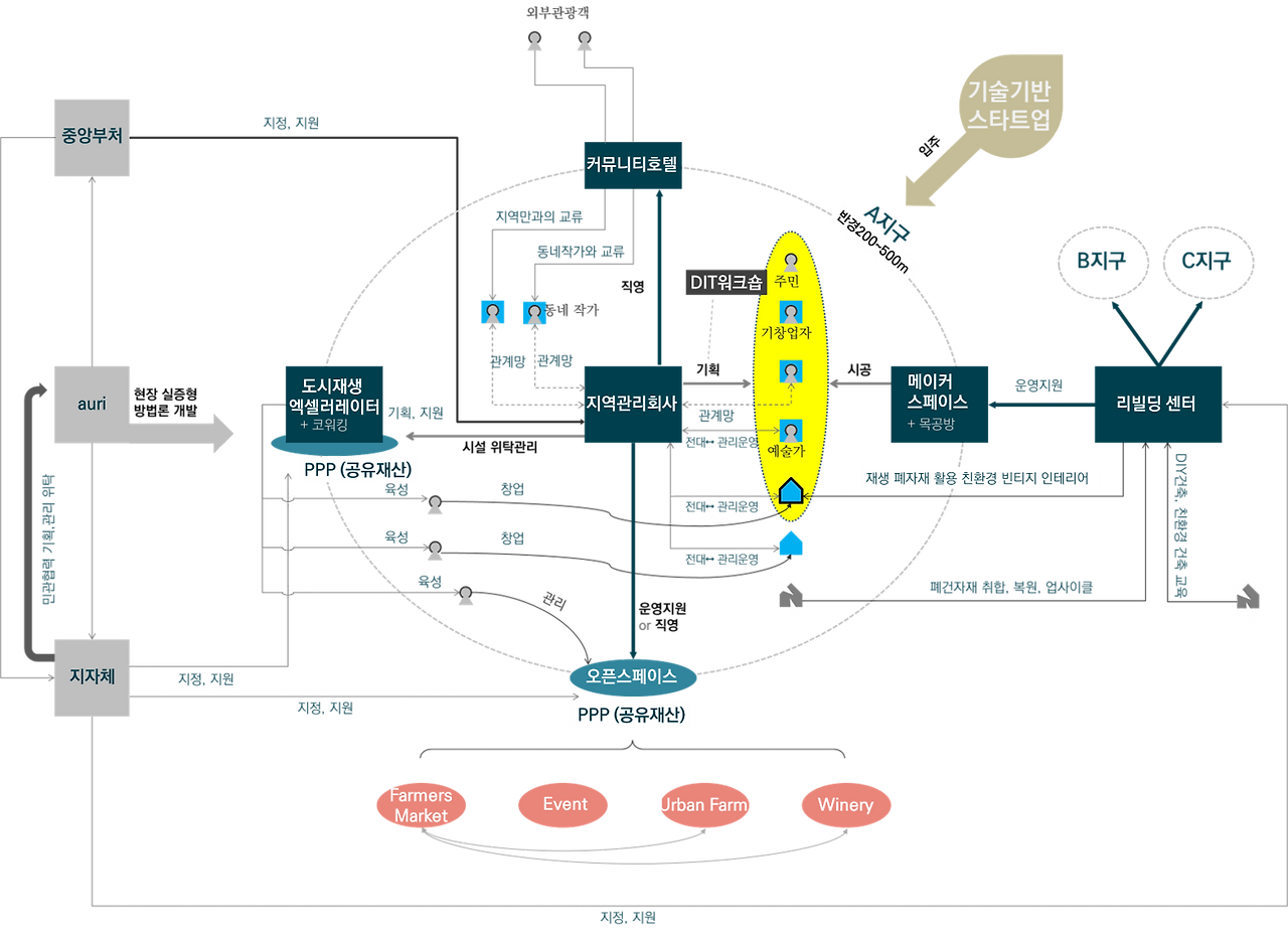 2016년 auri연구를 통해 "지역관리회사"라는 개념을 처음 제안했습니다. 지역관리회사의 핵심은 사람의 마음을 연결하고 융합시키는 것입니다. 크리에이터, 현장 연구자는 섬세한 감성을 무기로 동네를 바꿔가는 사람들인 만큼, 다치기 쉬운 예민한 감정을 품고 살기도 합니다. 이 마음들을 섬세하게 연결하고 민감하게 거리 조정하고 그로부터 잠재력을 증폭시키는 일이 작은 동네를 큰 가치로 키우는 지역관리회사의 역략입니다.