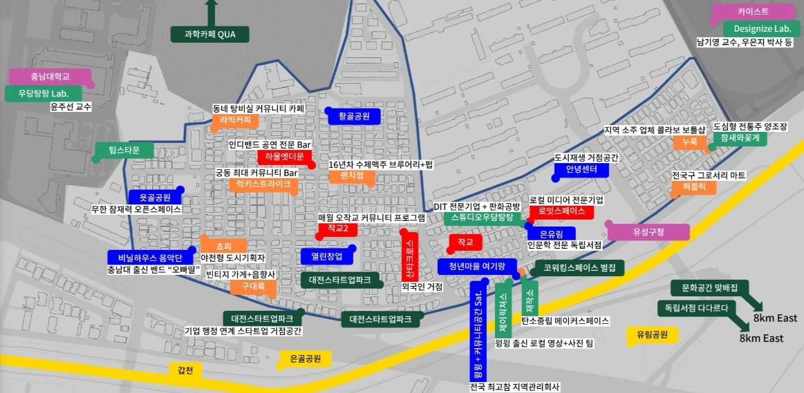지금은 행정과 언론에서도 어궁동을 어은동도 궁동도 아닌 애매한 지역이 아닌, 어은동+궁동 통합브랜드로 쓰고 있는 걸 보면 뿌듯합니다. 어궁동을 궁동과 어은동을 잇고 충남대와 카이스트를 잇고 내국인과 외국인을 잇는 도시브랜딩으로 제시했다는 것이 도시학자로서 기억에 남고 뿌듯합니다.