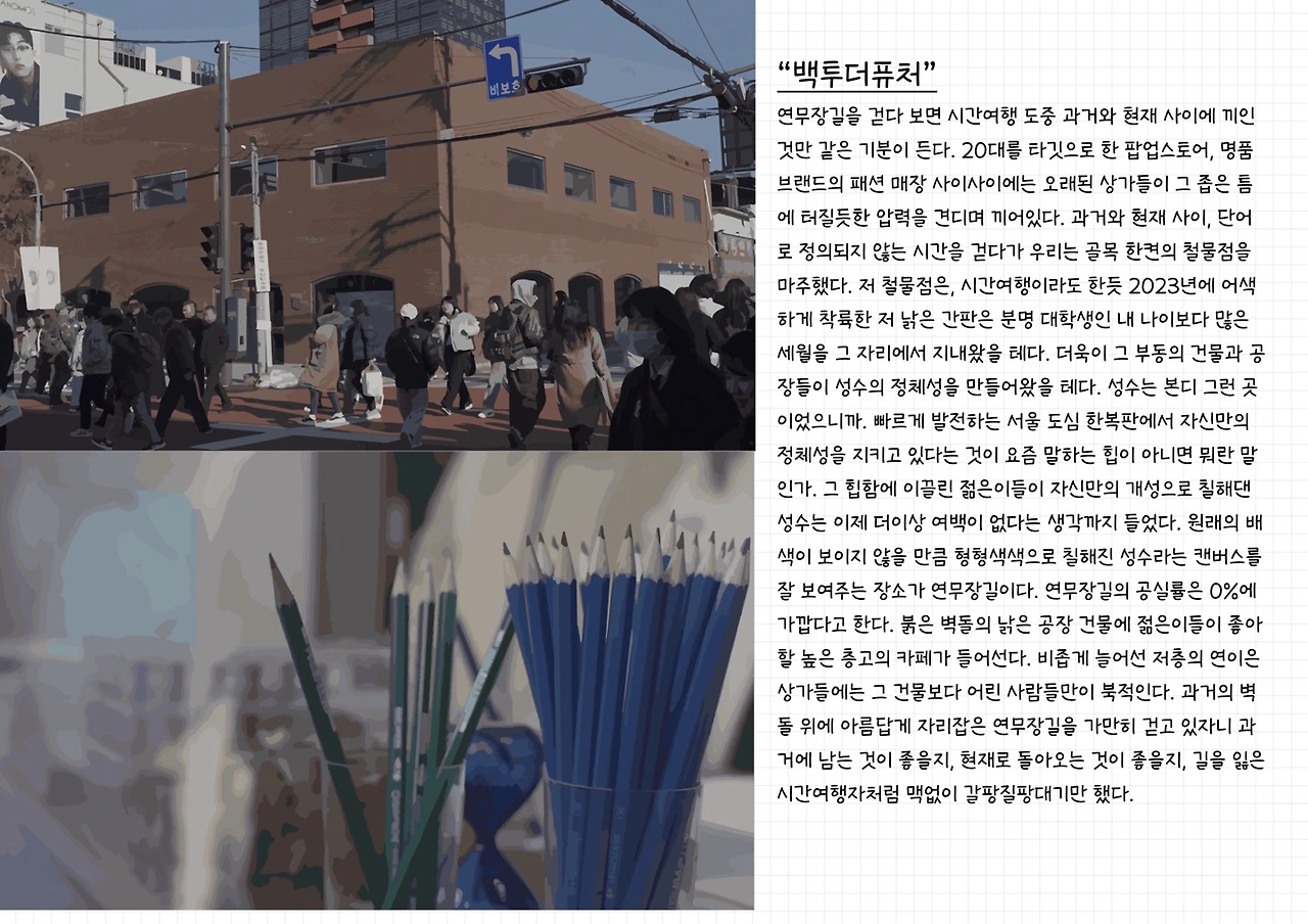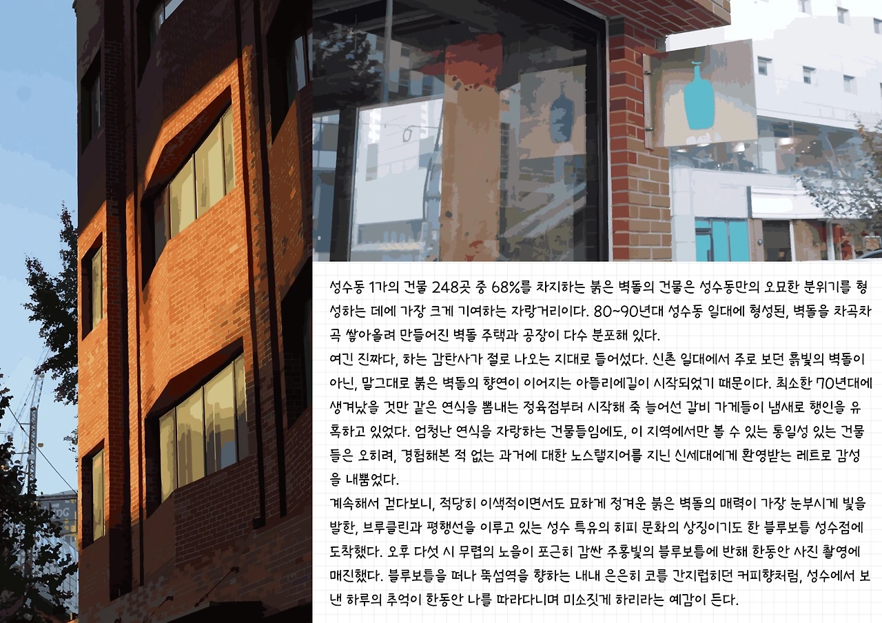 팝업스토어가 많다는 성수의 이미지는 번잡한 것을 싫어하는 나에게 오히려 마이너스 요소였다. 그러나 직접 가보니 생각이 달라졌다. 팝업스토어만으로는 성수를 설명할 수 없었다. 트렌디한 카페 옆에는 녹슨 네온 사인 간판의 파랑새 노래연습장이 있었고, 대형 자본 유입으로 개성을 잃을 위기에는 성수의 붉은 벽돌이 아직 우리는 건재하다는 듯이 존재감을 뽐내고 있었다. 성수가 너무 좋은 동네인 걸 알기에 고유의 매력이 사라지지 않았으면 좋겠다는 간절함을 안고 집에 돌아갔다.