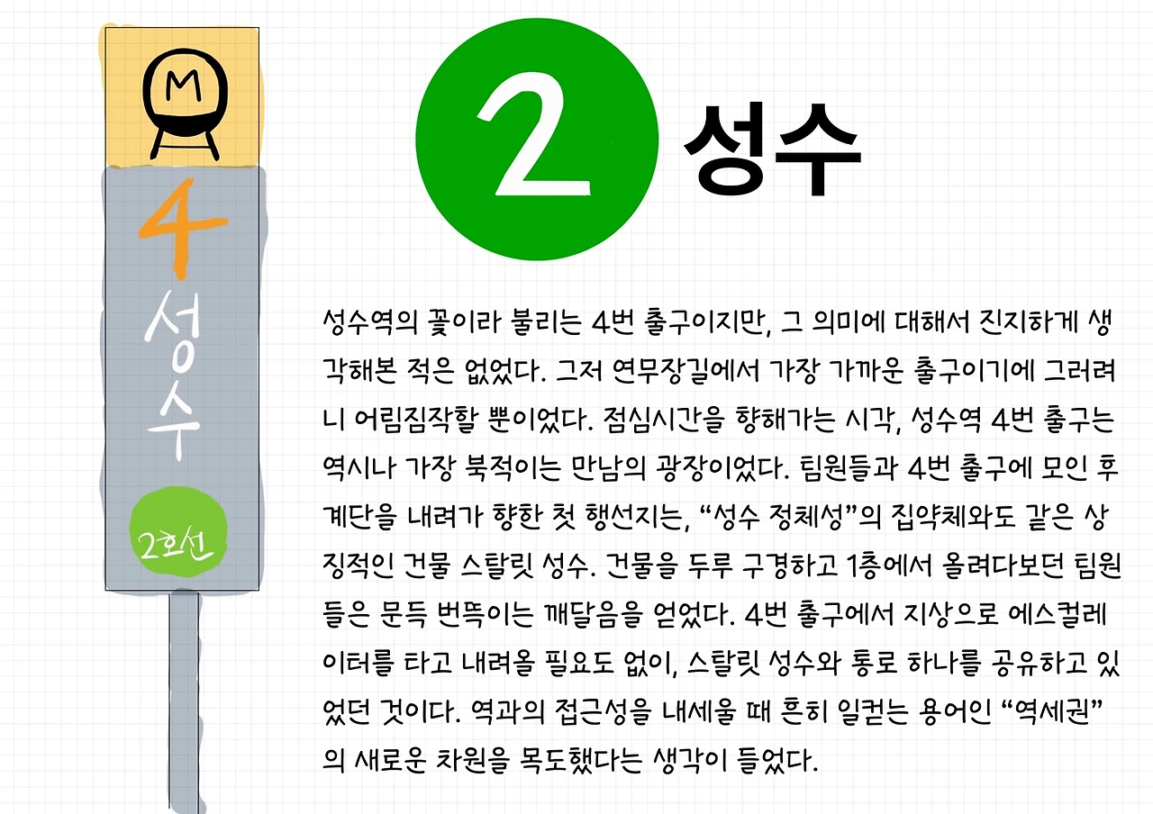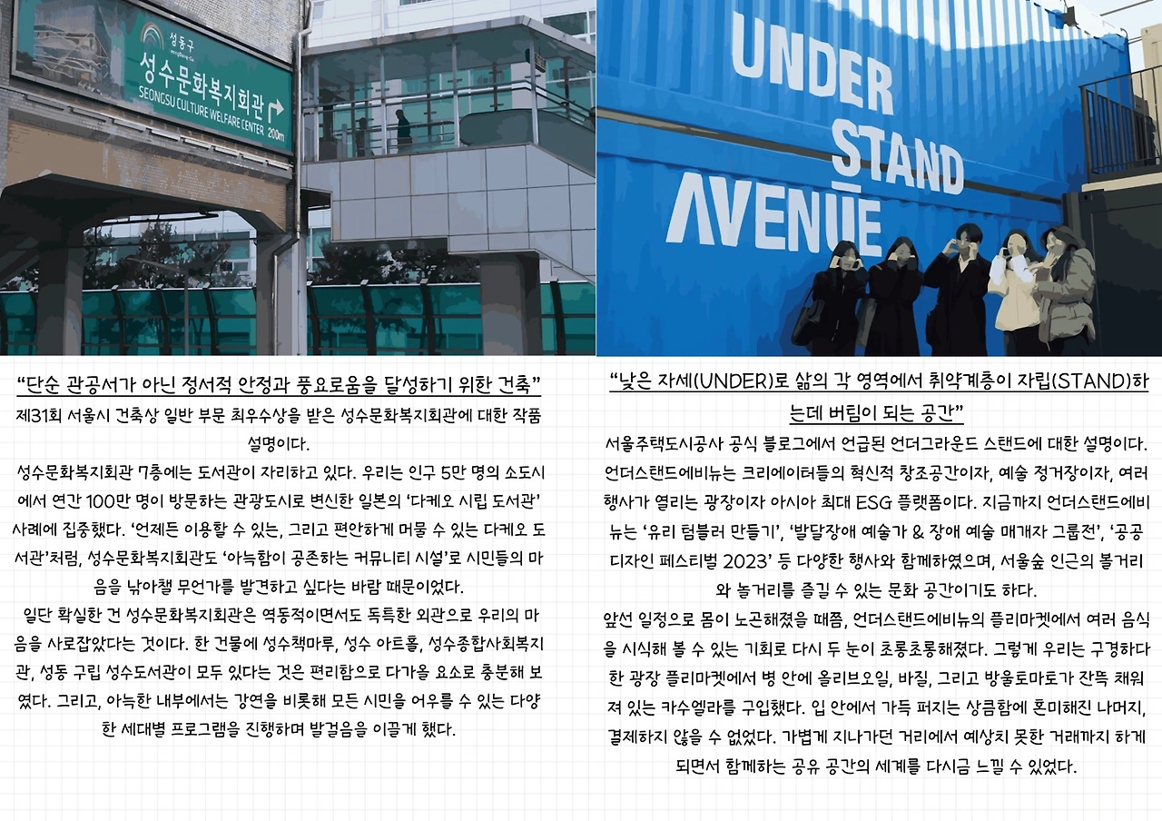 아울러, 성동구문화예술회관과 언더스탠드에비뉴를 거닐다 보면 원주민도 살기 좋은 도시로 가꾸기 위한 성수동의 노력을 느껴볼 수 있다. 이 글을 읽는 누군가도 성수에 방문해 유행 그 이상의 라이프스타일을 체험해 보길 바라며.