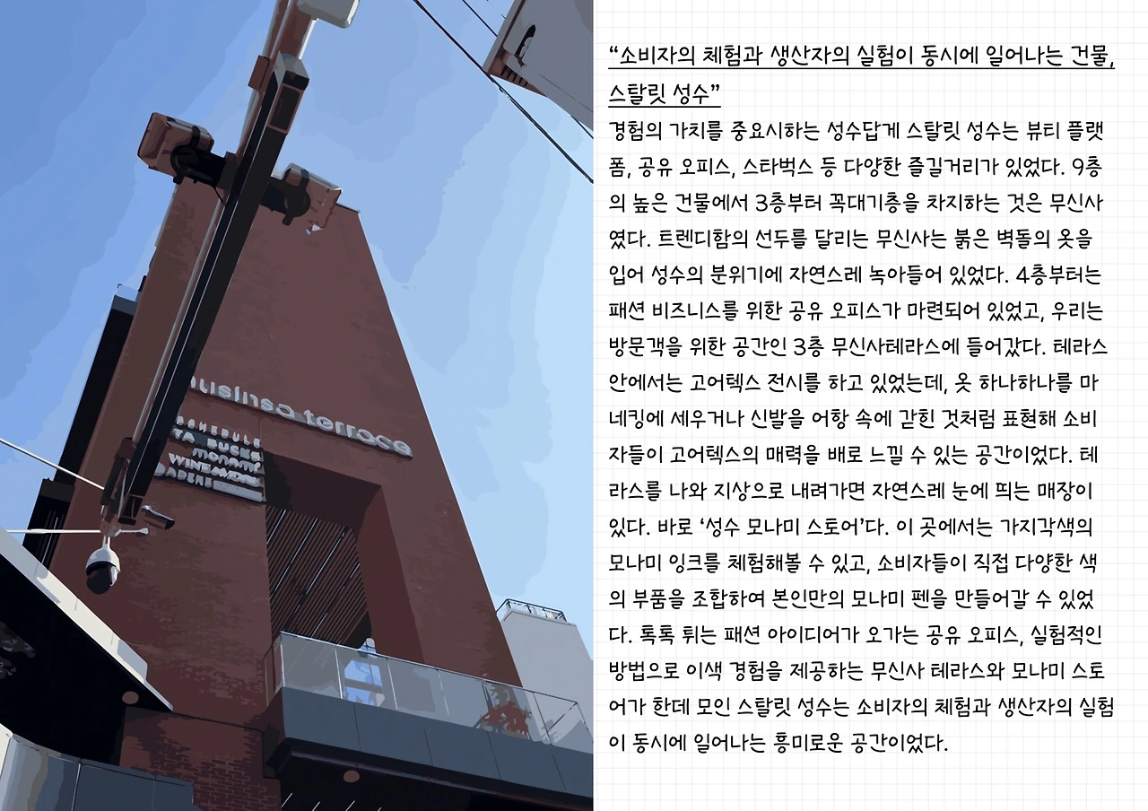 발견한 것은 폐창고, 공장을 개조한 성수만의 독창적인 상권, 차별화된 정체성이었다. 곳곳에 보이던 붉은 벽돌 건축양식도 성수만의 세련된 이미지를 잘 구현해 내고 있었다. '팝업스토어의 성지'라는 별명이 여러 문화 공간의 가치를 가리고 있던 건 아닐까.