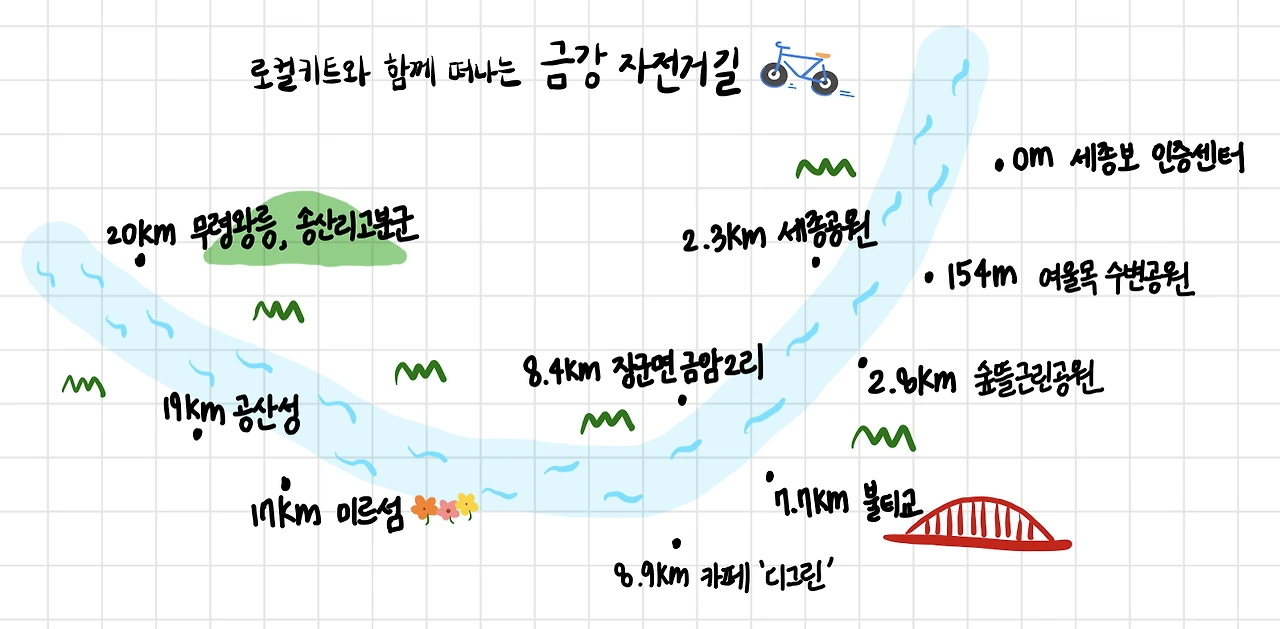 오전 7시에 대전에서 버스를 타고 출발해 우리의 시작점인 세종보 인증센터로 버스를 타고 향했다. 공용 자전거를 대여해 세종에서부터 직접 우리의 두 발로 자전거의 페달을 밟으며, 반나절 동안 금강 줄기를 따라 공주를 향해 적당한 속도로 달렸다. 금강을 따라 직접 두 발로 담아낸 다채로운 충청도의 이야기가 지금부터 시작된다.
