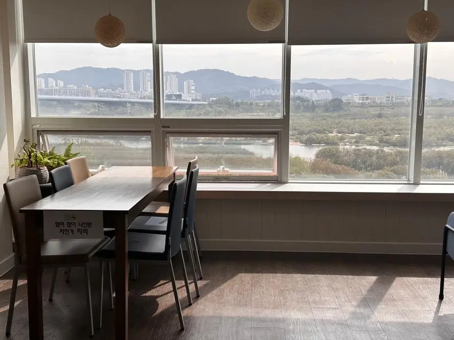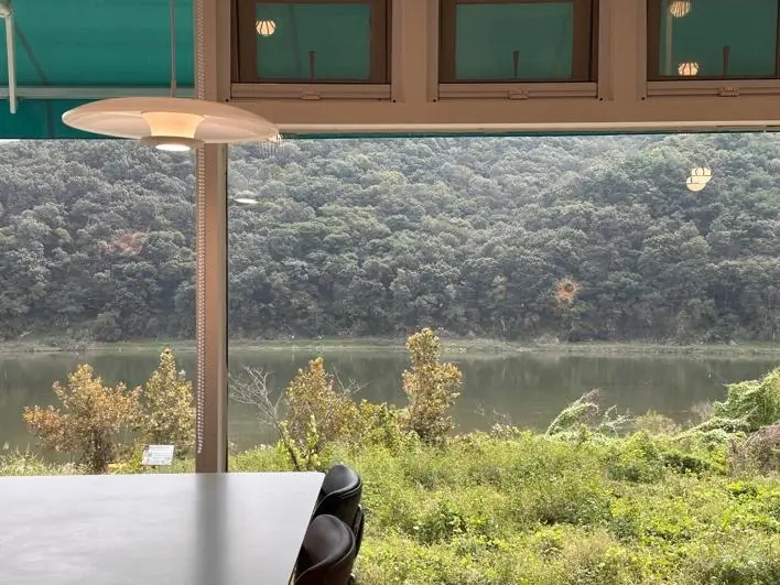 카페의 2층에 올라가서 통 창 너머로 푸르른 금강에 둘러싸인 웅장한 청벽산의 절경을 보고 있으면 한 폭의 산수화를 보고 있는 것 같다는 착각에 빠진다.