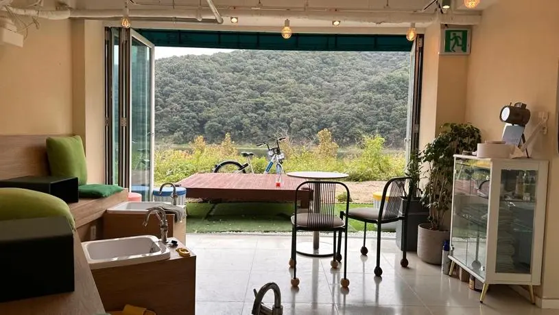 파노라마로 펼쳐지는 푸르른 금강과 청벽산의 경치를 눈앞에 두고 쉬어 가지 않을 수가 없는 이곳, ‘디그린’에는 자전거 탑승객을 위한 특별한 공간이 마련되어 있다. 바로 카페 내 족욕 공간인데, 금강 자전거도로 바로 앞에 위치해 있는 만큼 이곳을 지나치는 자전거 이용객들이 편안히 쉬었다 가기를 바라는 카페 사장님의 따뜻한 마음이 엿보인다.
