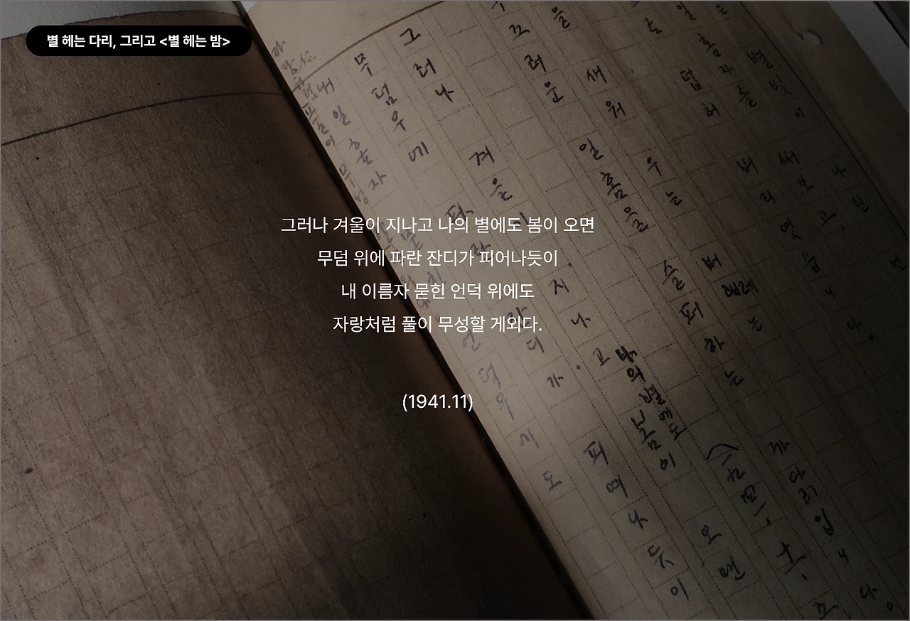 윤동주는 정병욱에게 "딴은 밤을 새워 우는 벌레는 / 부끄러운 이름을 슬퍼하는 까닭입니다"로 끝나는 <별 헤는 밤>의 첫 원고를 보여준 적 있다. 이후에는 “어쩐지 끝이 좀 허한 느낌이 든다”라고 넌지시 말한 정병욱의 의견을 받아들여 "지난번 정 형이 '별 헤는 밤'의 끝부분이 허전하다고 하셨지요. 이렇게 끝에다 덧붙여 보았습니다"라며 마지막 네 줄을 추가하였다. 별 헤는 다리를 건너는 사람들이 <별 헤는 밤>에 담긴 정병욱과 윤동주의 우정을 함께 떠올릴 수 있기를 바란다.