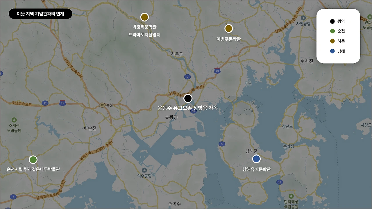 이웃 지역의 기념관과의 연계도 좋은 방안이 될 수 있다. 예를 들어 순천 낙안읍성 근처에는 소리를 동결하는 작업을 경제적으로 후원하고 민속 유물을 수집하며, 잡지 <뿌리깊은나무>·<샘이깊은물>을 발행했던 한창기를 기념하는 순천시립뿌리깊은나무박물관이 있다. 또한, 광양만을 사이에 두고 이웃한 남해의 유배문학관과는 대표 유배객 김만중의 <구운몽> 해제를 정병욱이 했다는 사실로 연결될 수 있다. 한편, 섬진강을 건너면 만날 수 있는 하동에는 이병주 문학관과 박경리 문학관, 그리고 드라마 ‘토지’의 세트장이 있다. 이러한 남해안 지역을 문학의 성지로 엮는다면 정병욱을 비롯한 여러 문화인들의 유형과 무형의 자취를 보존하고 전시함으로써 현대를 살아가고 있는 우리의 자존적 고유성과 정체성을 지켜 나가는 데에도 중요한 영향을 끼칠 수 있을 것이다. 광양이 안고 있는 풍부한 자산으로 지역의 학자들, 시민들이 모두 힘을 합쳐 광양만의 독특한 문화를 만들어야 하는 시점이다.