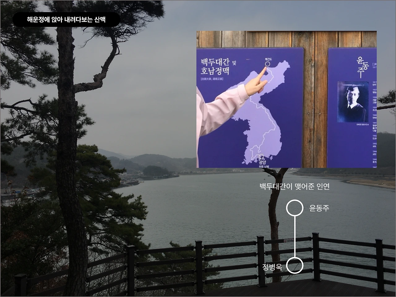 해운정은 배알도의 정상에 있는 정자로, 산맥이 내려다보이는 곳이다. 망덕포구는 백두산에서부터 뻗어 나온 큰 산줄기의 주요 맥이 남쪽 바다와 만나 끝나는 망덕산의 기슭에 자리하고 있다. 백두산 너머 북간도에서 나고 자란 윤동주 시인과 남쪽 바닷가에서 꿈을 키운 정병욱 선생의 운명적 만남을 가리키는 듯한 산줄기를 두고, 우리는 윤동주와 정병욱을 ‘백두대간이 맺어준 인연’이라 부르기도 한다. 별 헤는 다리를 건너 배알도에 도착해 섬의 정상인 해운정에 앉아 산맥을 내려다보며, 백두산 북쪽 끝자락의 용정 출신인 윤동주와 백두산 최장맥 남쪽 끝자락의 광양 출신인 정병욱의 만남을 상상해 보자.