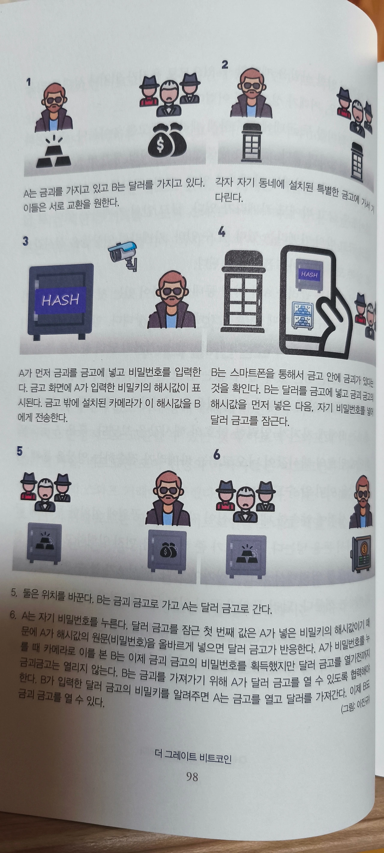 한편, 책 내용 중에 제 3자의 중재가 없고 거래 상대에 대해 완전히 무지한 상태임에도 안정적으로 교환할 수 있다는 아토믹 스와프의 기준에 대한 설명을 아래 그림과 같이 두 개의 떨어진 금고를 예시로 설명해 주는데 오호 정말 재미있다. 완전 아라비안나이트야.