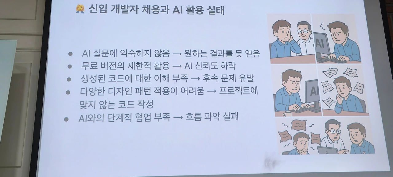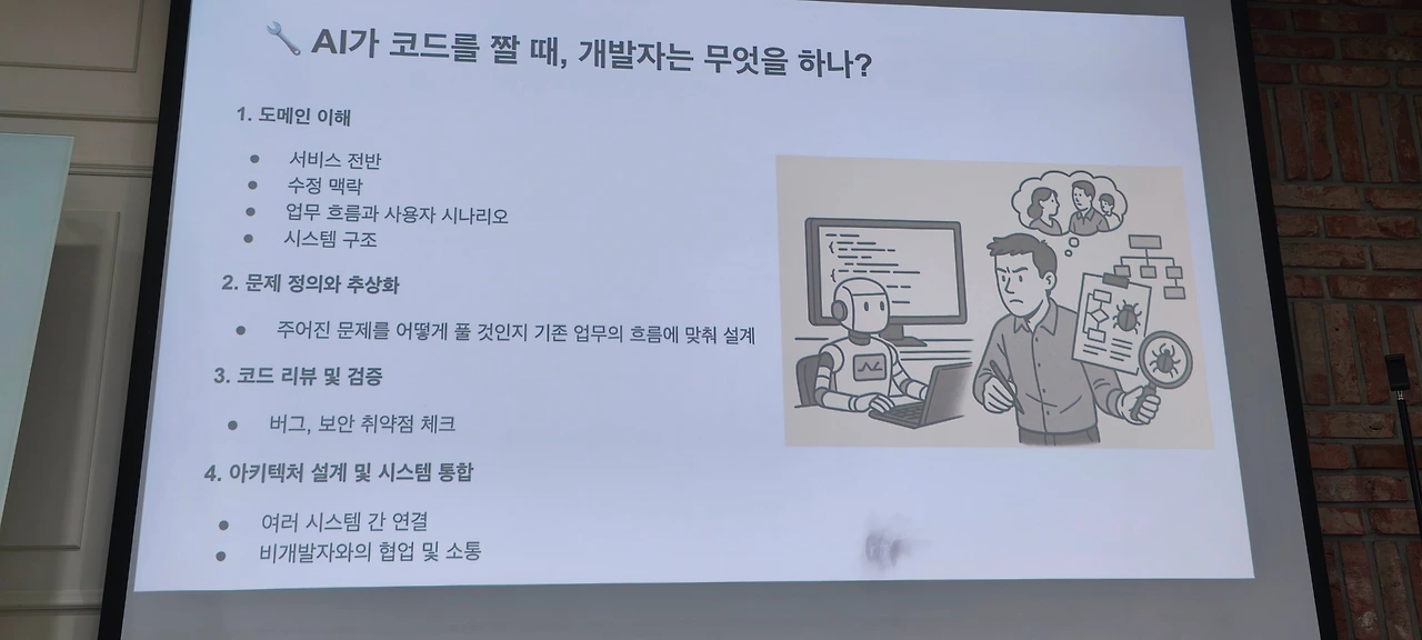 마지막 세션은 개발자 채용 현실판에 대한 썰 풀기였는데 개발자로서의 취직과 회사에서 살아남기와 이직에 대한 이야기였고, 그중에 1. 질문하기(물론 AI에게도), 2. 나무만 보지 말고 숲을 보라 가 인상적이었다.