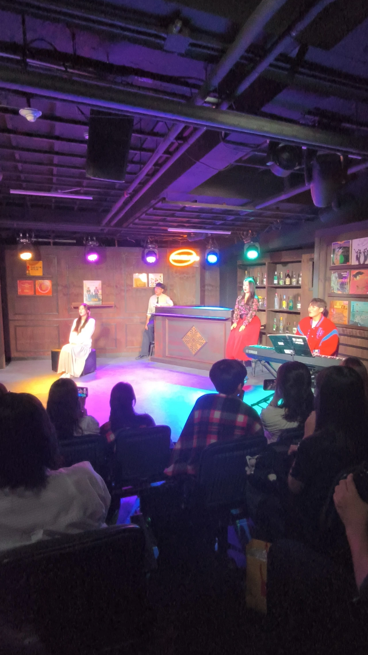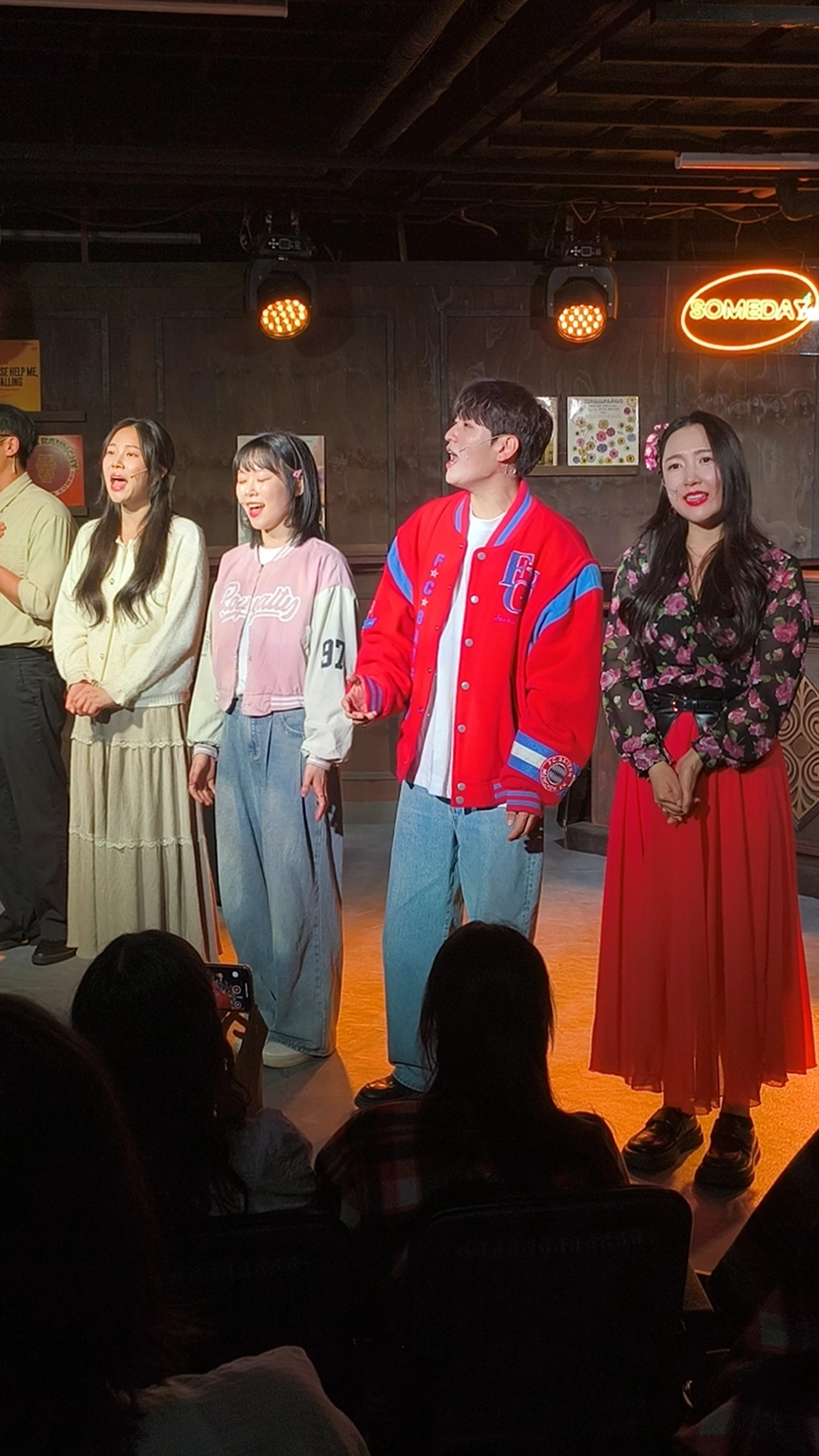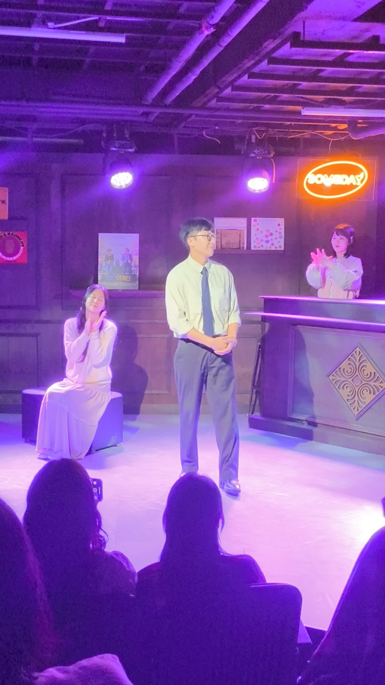 왼쪽에 앉아있는 지해역 배우님이 연기도 이쁘고 노래도 아주 이뻤다. 내 뒷자리에 앉은 아들이 소리 없이 엄청 울었다고 공연이 끝나고 나에게 말해주었다. 바 사장인 우연희역님도 참 연기 잘하였다. 연수역도 잘하고.