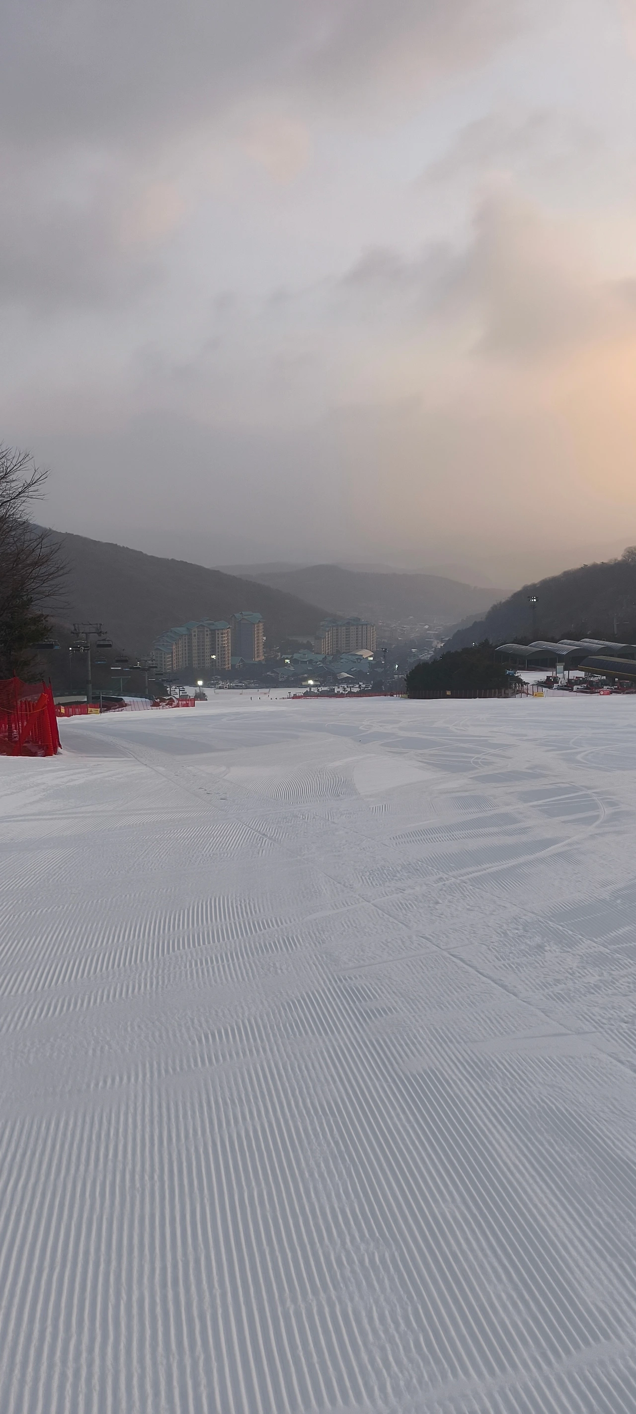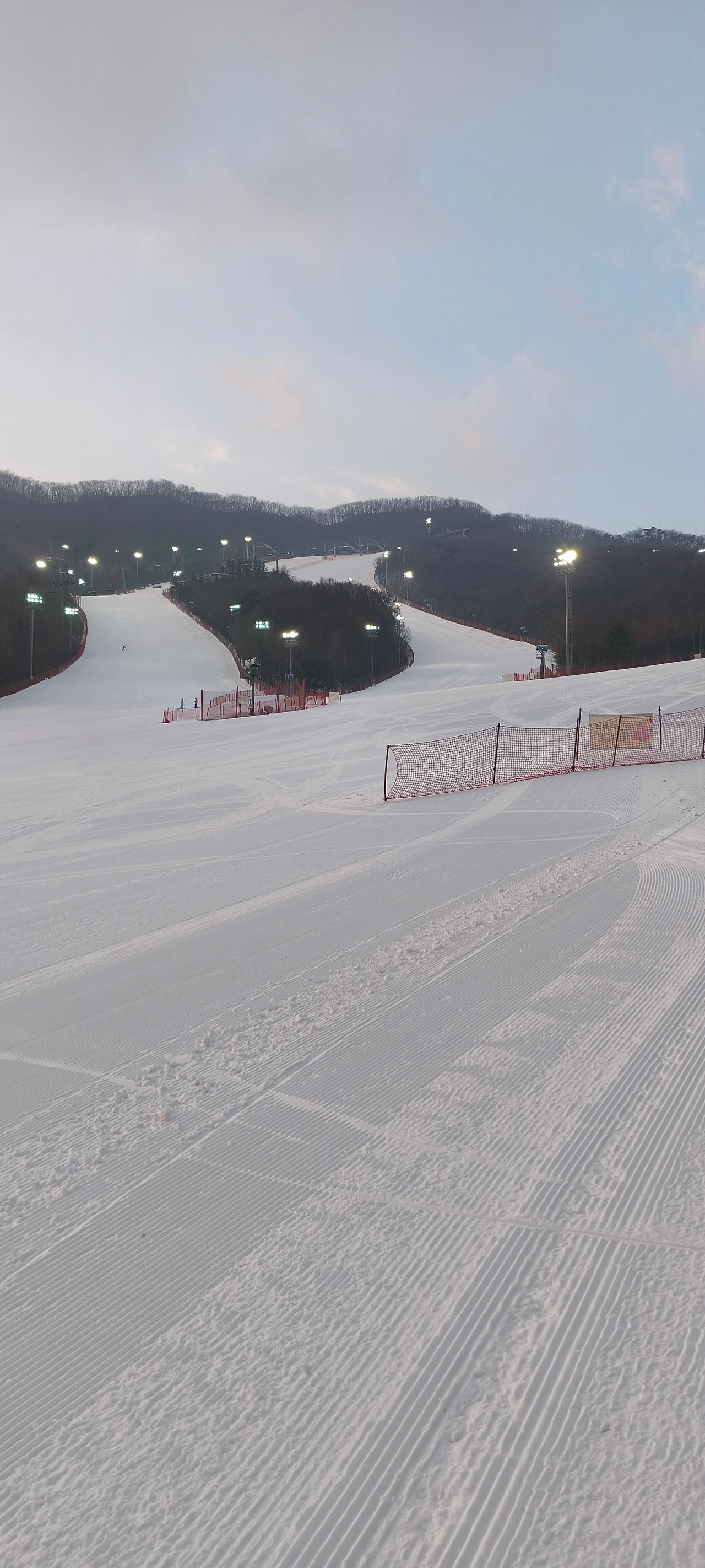 그리하여 아직 학기 중인 애 둘은 놔두고 시간 되는 큰 아들과 막내딸과 갔다. 오전 7시 40분경 도착하여 처음 보는 거대한 슬로프의 전경이 가슴을 두근두근하게 하였다. 딱 봐도 폭넓은 슬로프, 이른 아침부터 환하게 조명이 켜있는 모습을 보니 어서 슬로프로 다가가고 싶어졌다.