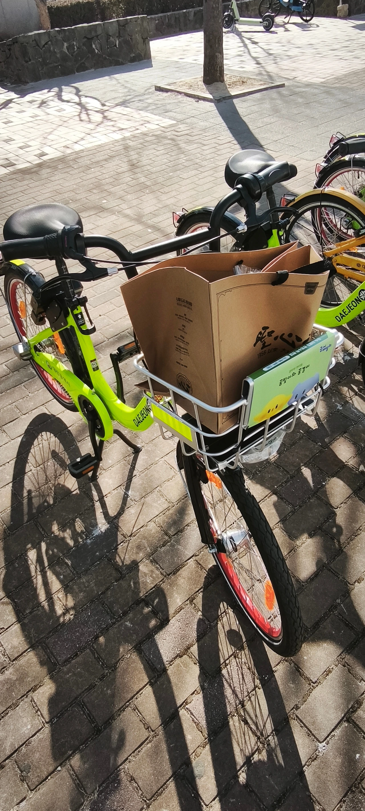 그렇게 걷기 시작하다가 공용자전거 타슈가 보였다 흠.. 자전거 타고 빠르게 다녀오자 바람을 가르며 가끔씩 땡땡! 도 울려주면서 페달을 밟았다 20여분 정도 탔나 어느덧 DCC 성심당 입구 타슈 거치대에 연녹색, 주황색 자전거들이 밀집해 있는 것이 멀리서도 보였다 자물쇠를 채우고 운행 종료 확인 멘트를 들은 후 성심당 대기줄에 섰고 대기 시간은 대략 10분 정도 걸렸다