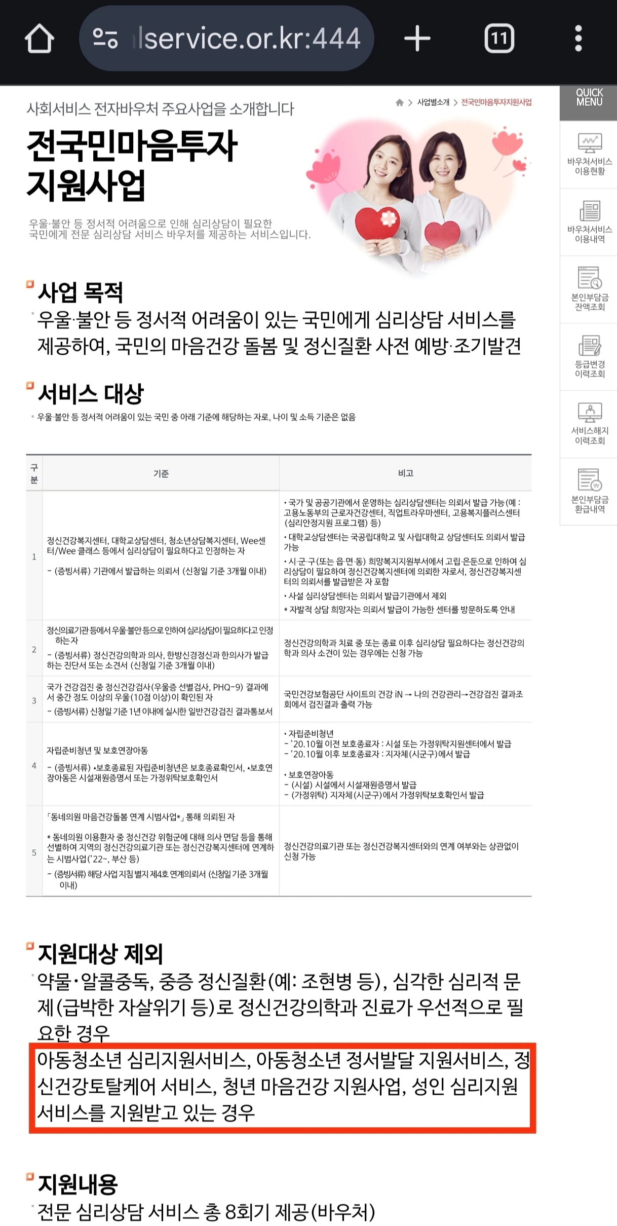 또한 아래와 같이 심리상담 정부 지원 사업이 있어서 저렴한 가격으로 심리 상담을 이용할 수도 있습니다. 신청 기간은 올해 말까지. 저도 얼른 신청해서 혜택을 누려 봐야겠습니다.