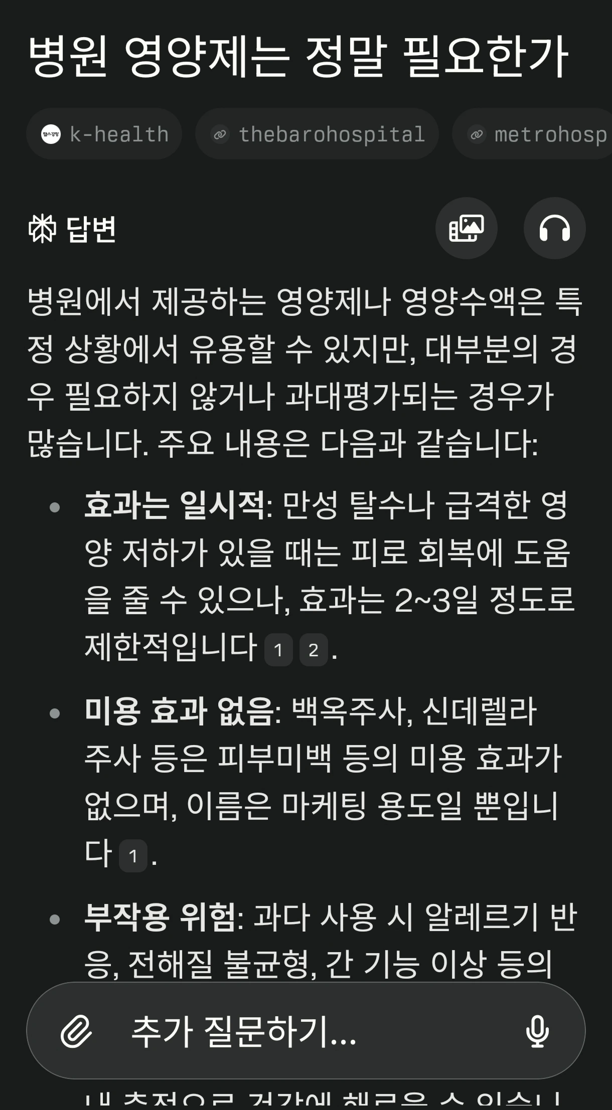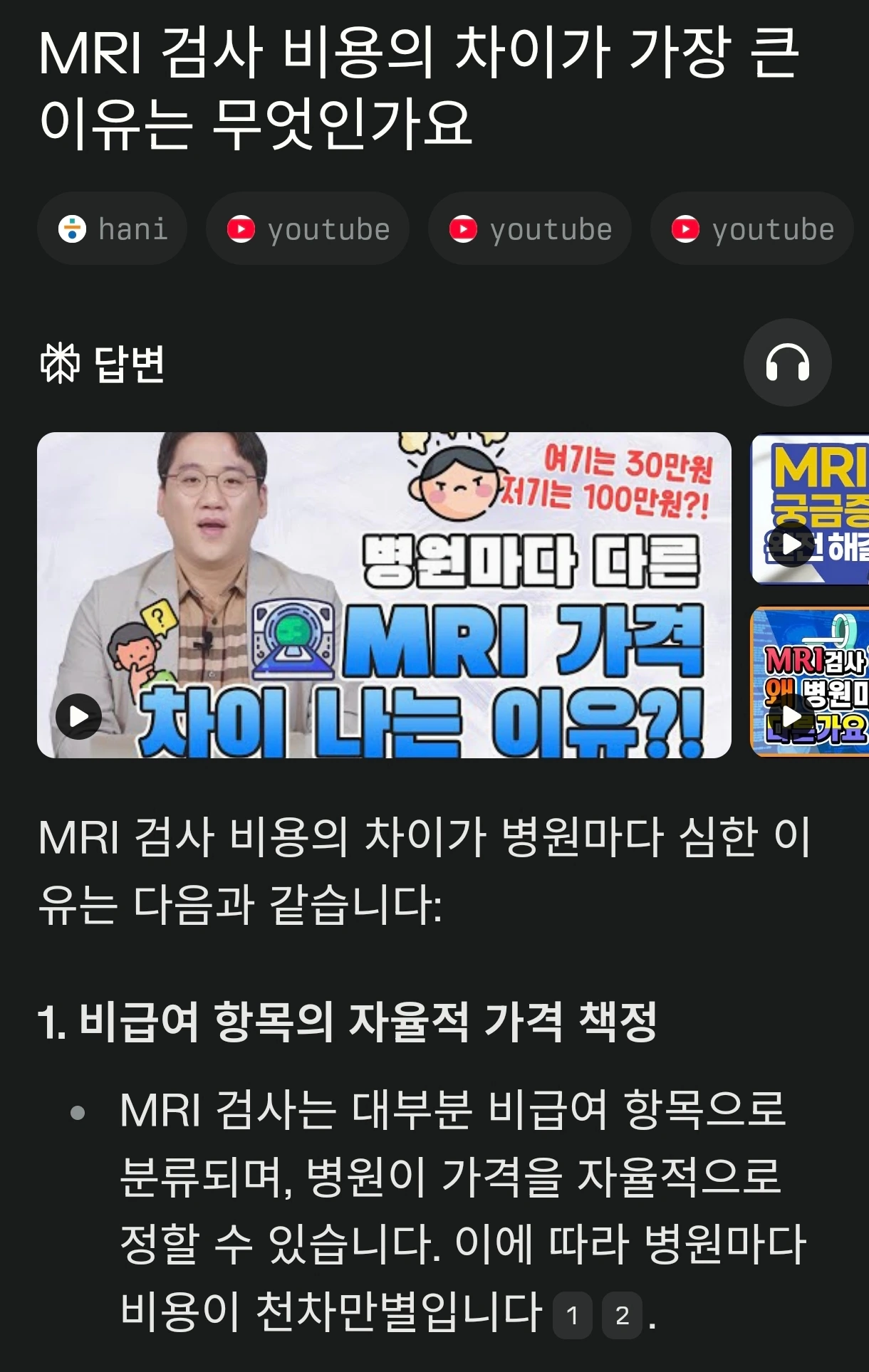 요즘 자주 애용하고 있는 검색 엔진 Perplexity로 "Z대학병원 비급여 진료에서 비싼 게 뭐냐"라고 질문을 던지니 Z대학병원의 MRI 평균 비용이 60만 원 초반대이고 전국에서 최고로 비싼 수준이라고 바로 답변이 나왔다. 하물며 70만 원대이다. 참 별별 정보가 다 나온다. 어떤 복잡한 질문을 던져도 그 질문 수준에 맞게 근거자료까지 다 첨부해서 자세히 답변해 주는 Perplexity이다. Perplexity도 여러 옵션이 있는데 최상위 검색기능을 써보니 몇 분씩 AI를 돌려서 매우 상세한 정보를 알려주었다. 하지만 무료로 사용하는 횟수는 제한되어 있고 그 이상은 유료로 써야 한다.