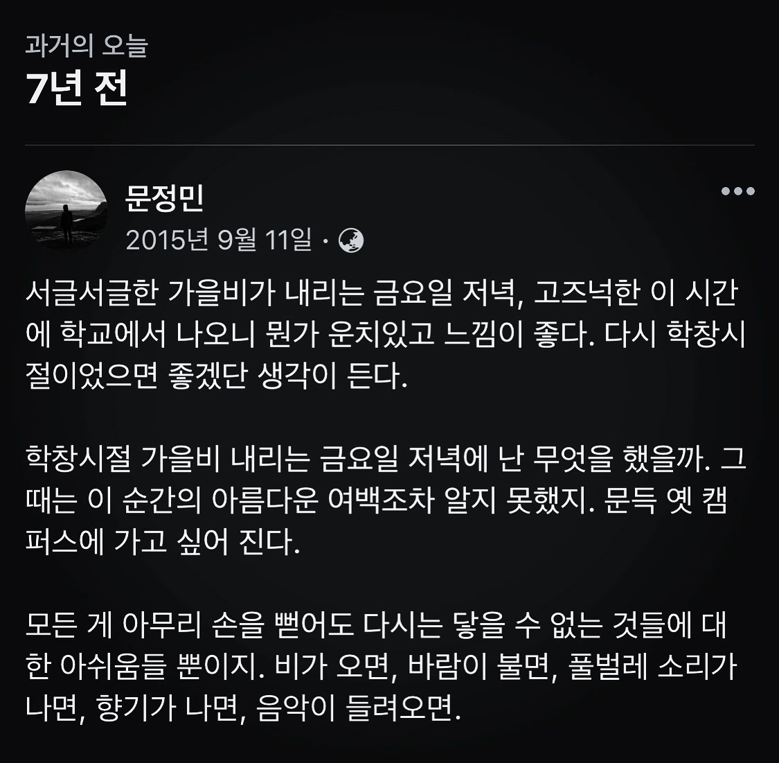늘 가을 이맘때가 되면 이 글이 돌아온다. 이제는 그 학창 시절은 물론, 고즈넉한 그 학교도 영영 돌아갈 수 없는 곳이 되었지만 그때의 그 감정과 마음으로 하나의 곡, 하나의 가사가 세상에 남았다.