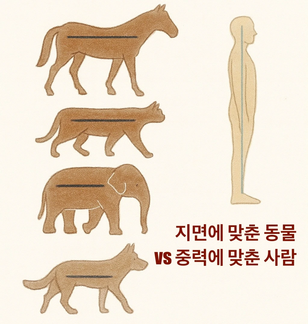 네발동물은 몸통을 지면에 수평으로 맞추도록 설계되었습니다. 반면 인간은 몸통을 중력에 수평으로 맞추도록 설계됐습니다. 몸통이 중력선과 평행하면, “몸”은 최소 에너지로 최대 효율을 내고, 그러면 “뇌”는 큰 에너지를 쓸 수 있습니다. 이것은 인간이 “생각하는 존재”로 살아가기 위한 몸의 구조적 설계입니다.