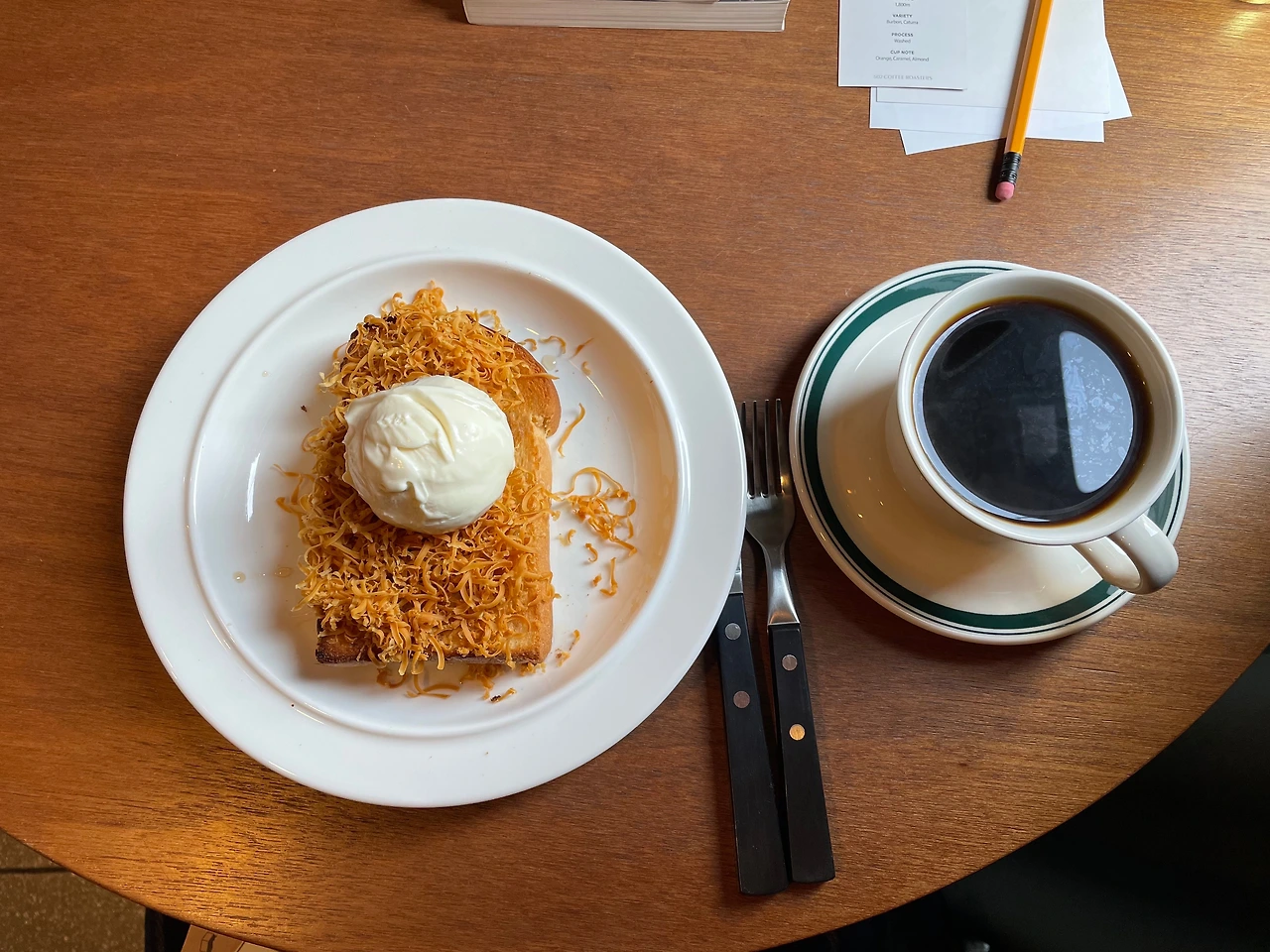 아직은 낯선 공간이지만 편안한 분위기를 뿜어내는 공간. 벽면에는 사람들이 카페에서 적어 내려 간 메시지들과 그림이 붙어 있었는데 손님들의 카페에 대한 애정이 묻어 나왔다. 그만큼 이 공간을 사랑하는 사람들이 많이 존재한다는 것. 나도 카페 한편에 준비되어 있는 메모지와 연필 한 자루를 들고 자리로 돌아왔다. 내가 앉았던 자리 옆에는 책꽂이에 책들이 쭉 꽂혀있었고 나는 끌리는 책들을 하나씩 집어 들고 읽기 시작했다. 이때 읽었던 책이 바로 '채식주의자'다. 어찌나 흥미롭고 강렬하던지 앉은 그 자리에서 완독 해버렸다. 소설인데 이렇게 빨리 읽은 책은 채식주의자가 거의 처음인듯하다. 사장님께서 천천히 드립을 내려주시니 작은 카페 공간에 고소하고 달큰한 커피 향기가 가득 퍼졌다. 작은 카페의 매력을 다시 느꼈던 시간. 이윽고 사장님께서 자리로 브라운 치즈 토스트와 드립 커피를 가져다주시고 나는 잠깐 동안 커피의 향을 맡으며 올라오는 커피의 김을 느꼈다. 점심을 안 먹은 터라 토스트와 커피는 가벼운 점심으로도 적당했다.