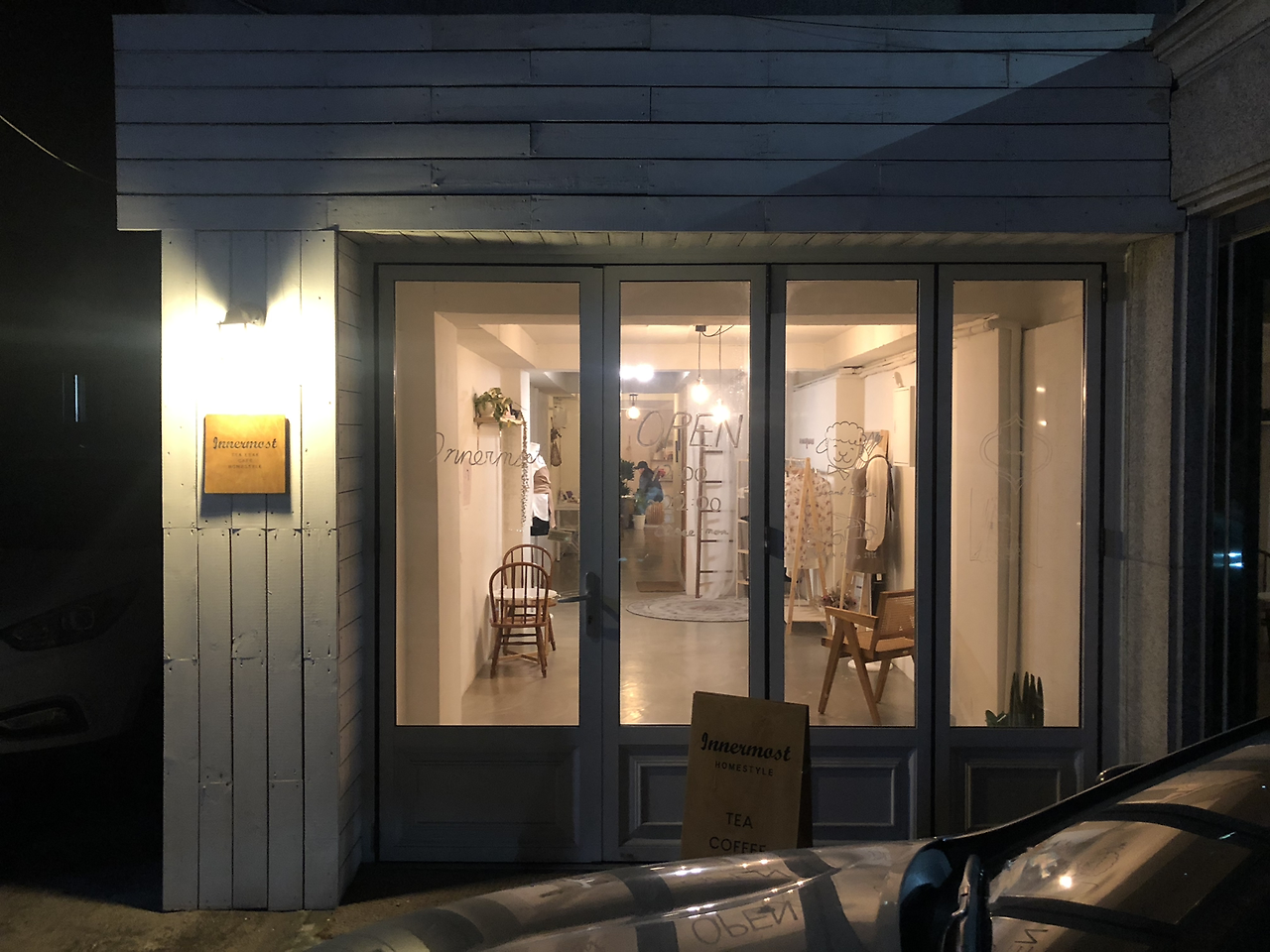뭔가 차분하고 러블리한 감성을 밖에서부터 느낄 수 있다. 앞에 차 한 대까지 주차가 가능하다.